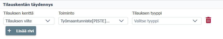 Asiakkaan tietoihin “Tilauskentän täydennys” -osioon tulee valita “Tilauksen viite” sekä se, että erotellaanko tunniste ja littera pisteellä vai kenolla. Lisäksi voi valita, onko toiminto tilaustyyppikohtainen vai päteekö se kaikille tilaustyypeille (=tyhjä).