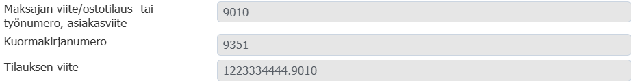 Kun sitten tilaukselle laitetaan littera (“Maksajan viite/ostotilaus- tai työnumero, asiakasviite” -kenttä), joko Zeuksessa tai Fluidissa, koostuvat tiedot automaattisesti tilaukselle Tilauksen viite -kenttään: