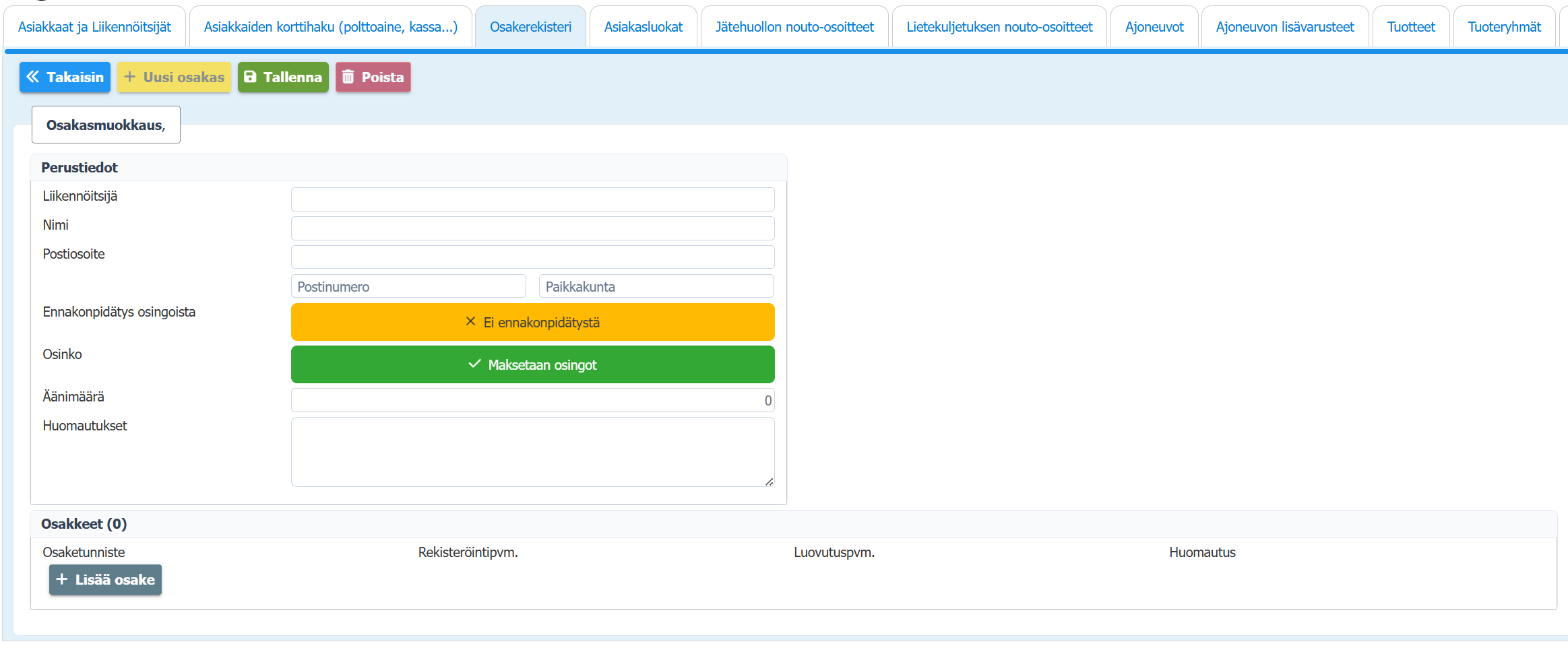 Klikkaa +Uusi osakas -painiketta ja täydennä tiedot.