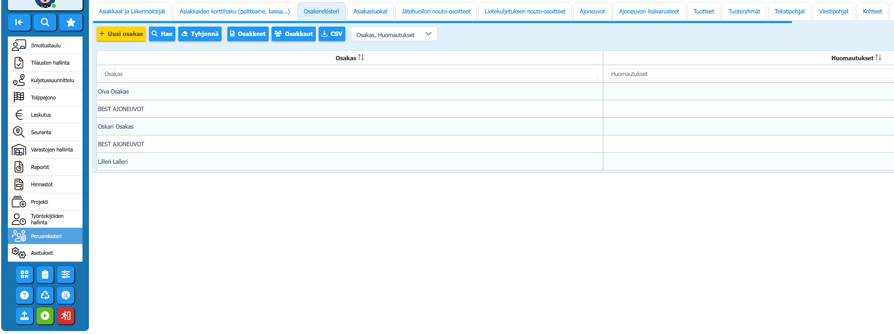 Liikennöitsijän osakerekisteriä ylläpidetään perusrekisterin “Osakerekisteri” -välilehdellä.