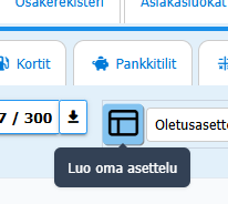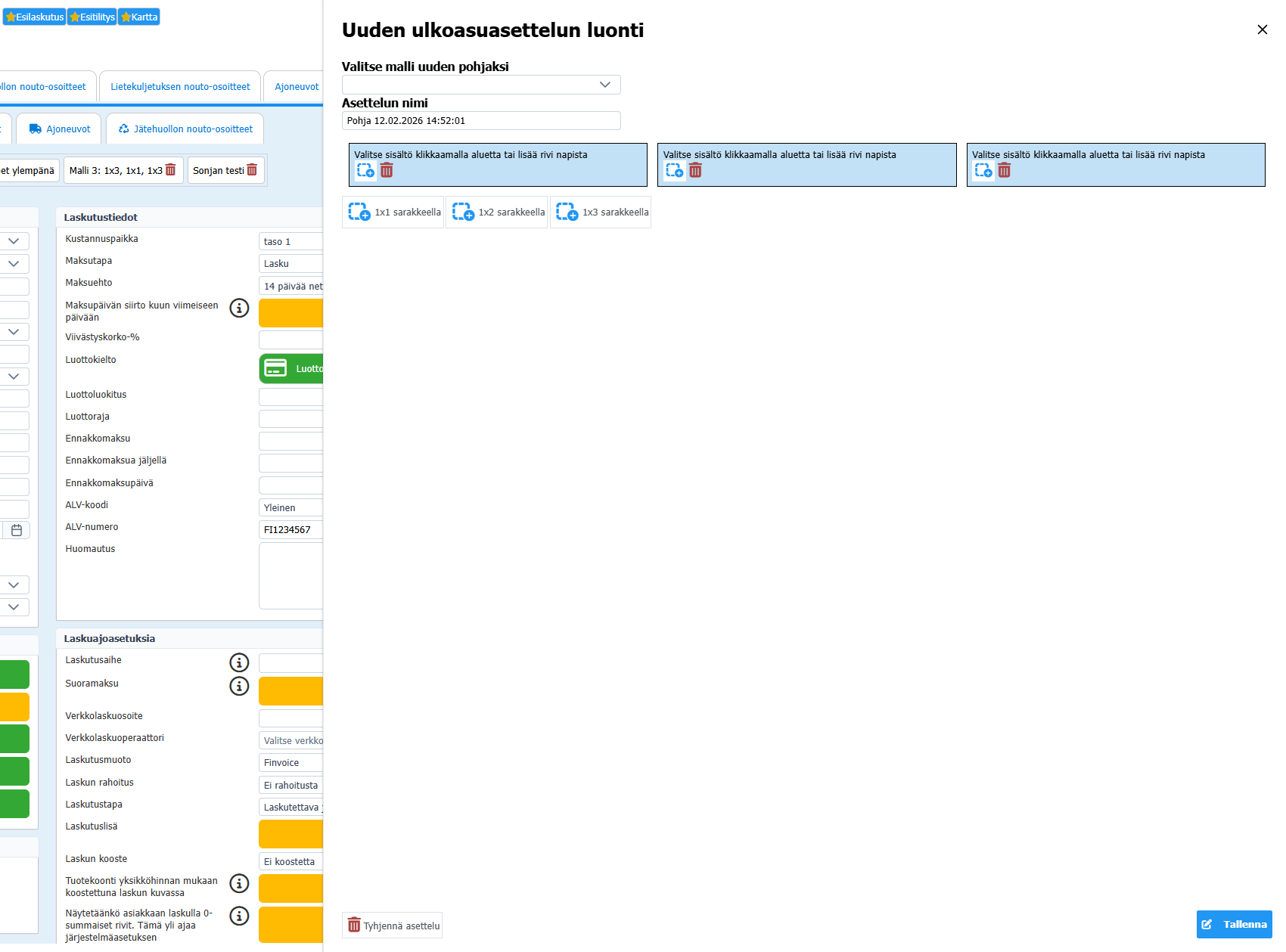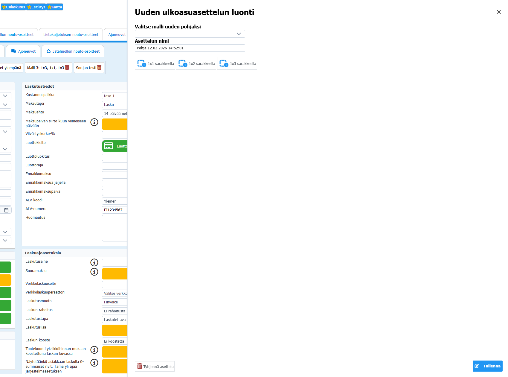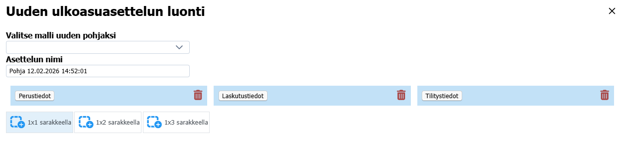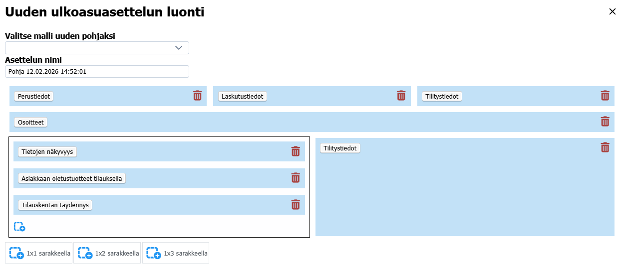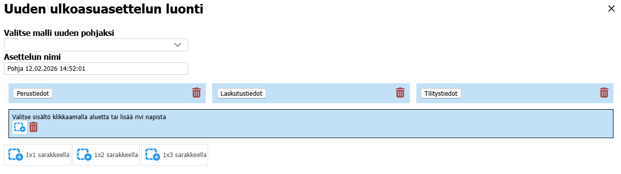 Napin klikkaaminen avaa oikealta palkin, jossa uuden asettelun luominen tapahtuu. Asettelun nimi -kenttään kannattaa kirjoittaa jokin selkeä nimi, muuten järjestelmä päättelee sen itse.