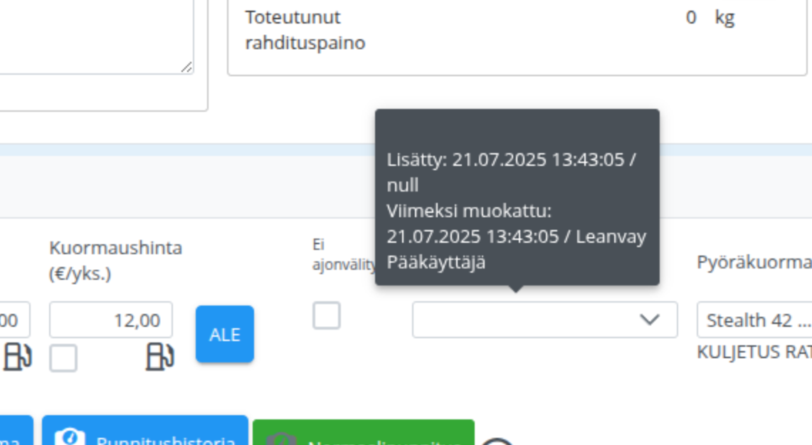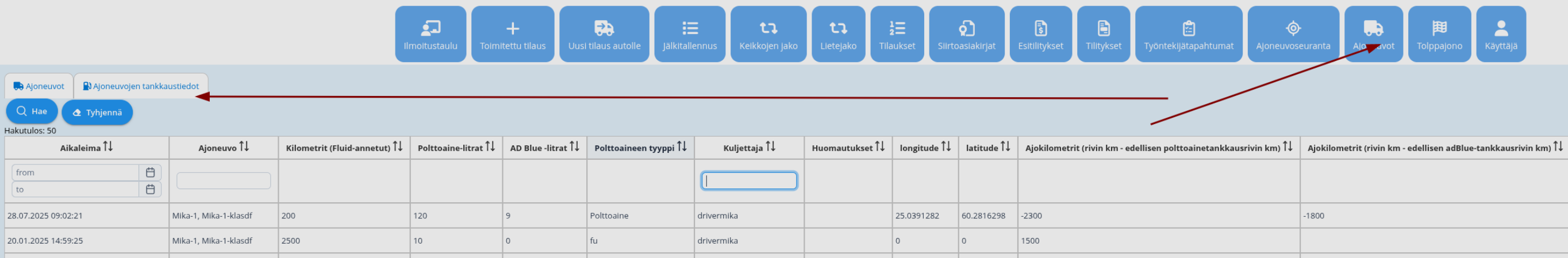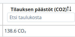 - [Uusi] Tilausten lista: Lisätty Tilauksen päästöt -sarake, lasketaan siihen päästöt, jos tilauksella on kilometrit ja tilauksen ajaneella ajoneuvolla päästöarvo.