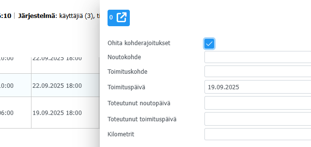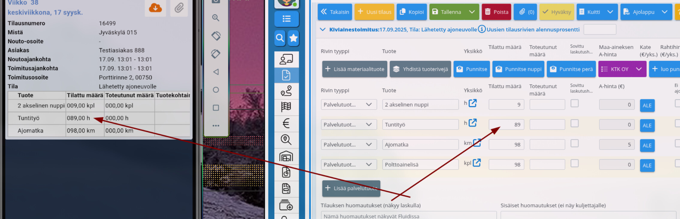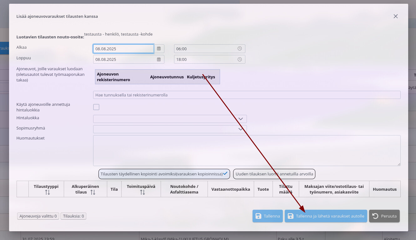 - [Uusi] Tilausten hallinta, Työmaatilaukset: “Lisää ajoneuvovaraukset tilausten kanssa” -toiminnallisuuteen lisätty mahdolliseksi lähettää varaukset autoille suoraan luontinäkymästä.