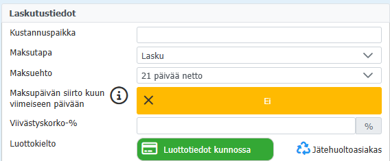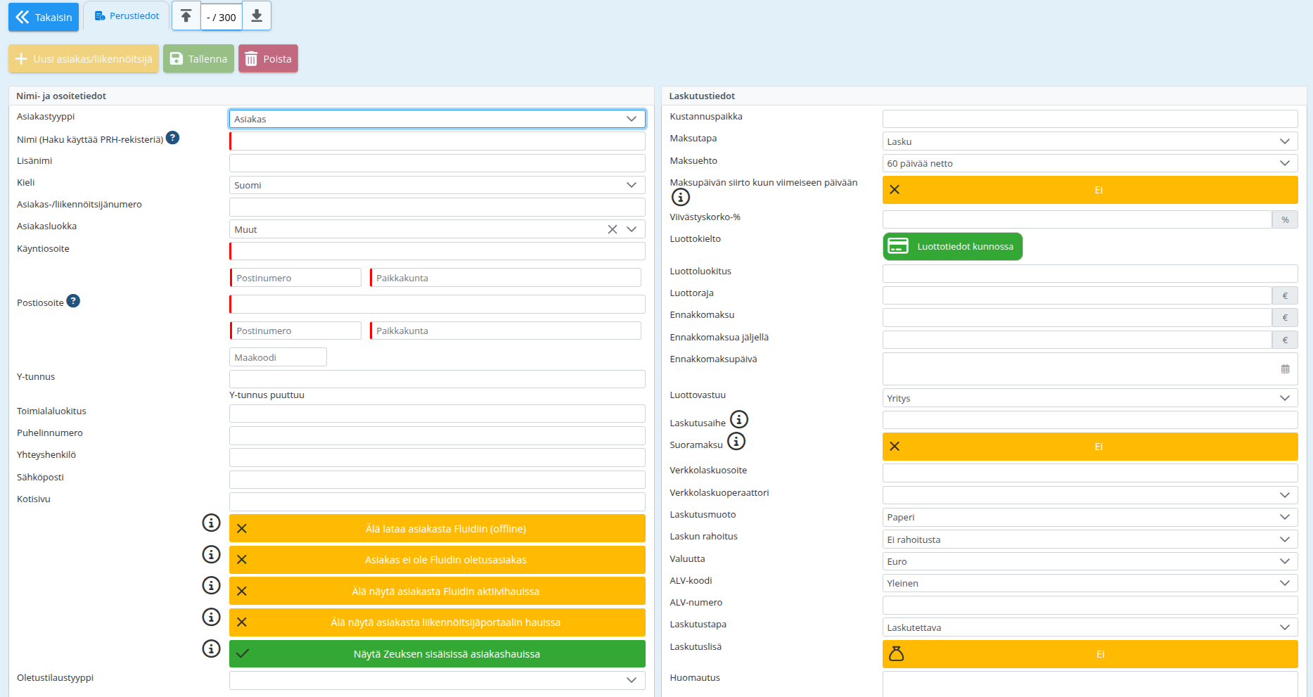 - [Korjaus] Kun Fluidista luotiin asiakas, meni ko. asiakkaalle oletuksena päälle “Fluidin oletusasiakas” -valinta. Huom: Fluidin oletusasiakkaita on suositeltavaa olla järjestelmässä vain yksi, etenkin jos on käytössä Fluidin Pyöräkuormaaja-osio ja siellä toiminnot, joihin tulee oletuksena asiakas (esim. muut työt tai pyöräkuormaajatyön automaattisesti laskettavat tunnit).
