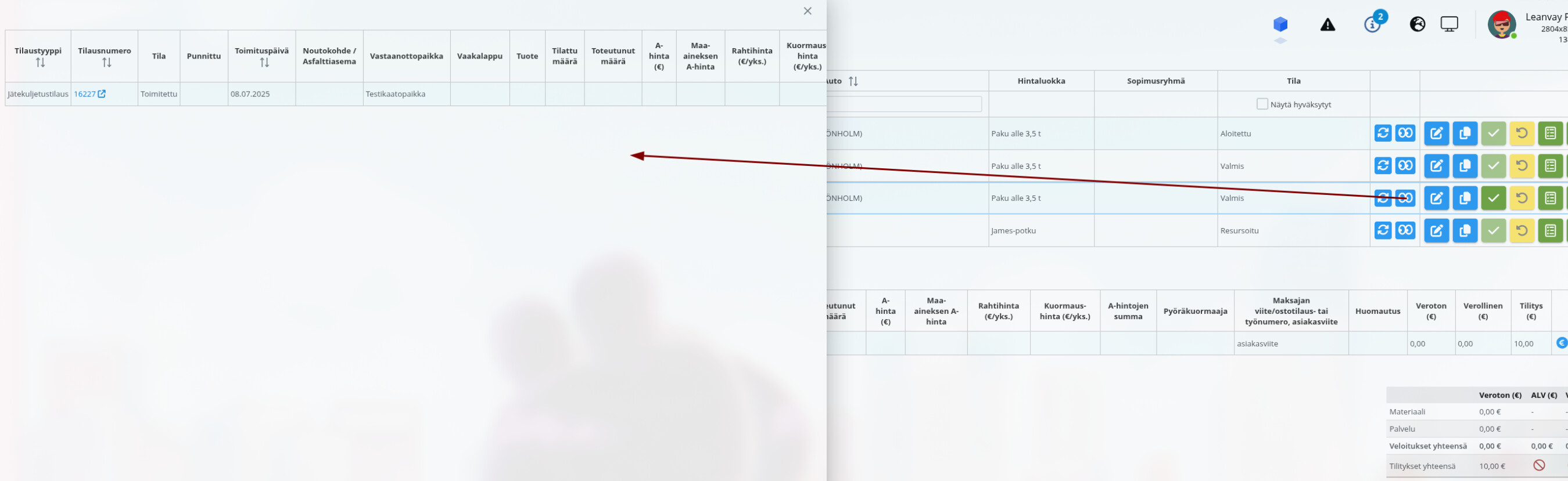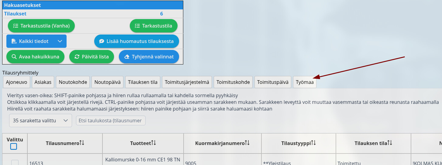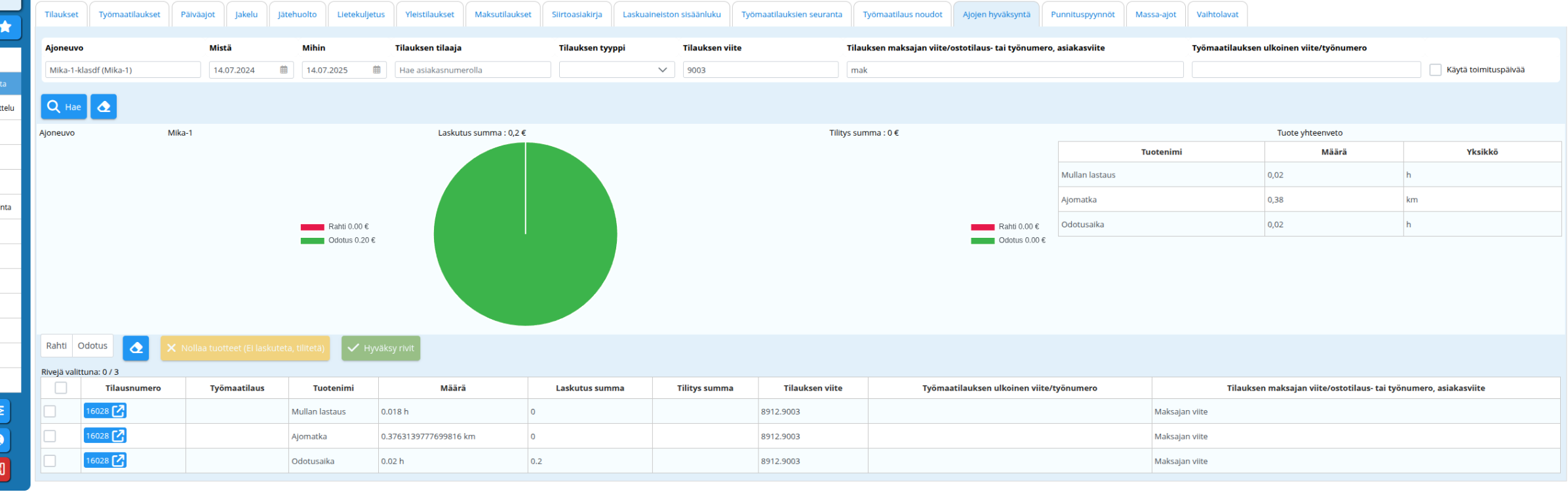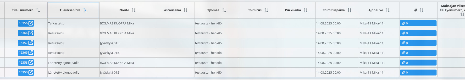- [Muutos] Tilausten hallinta, Ajojen hyväksyntä: Lisätty taulukkoon uusia sarakkeita sekä lisätty mahdollisuus hakea työmaan viitteellä ja tilauksen maksajan viitteellä.