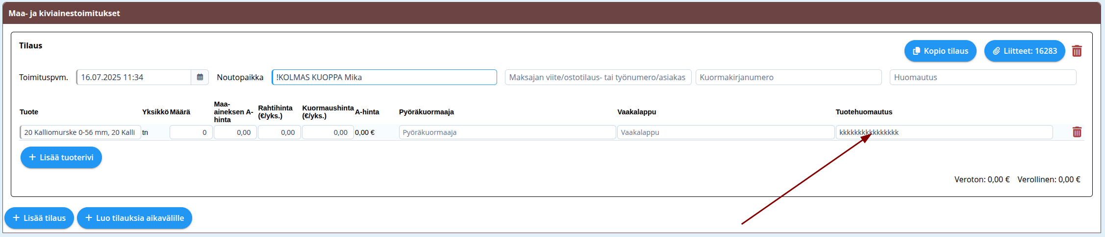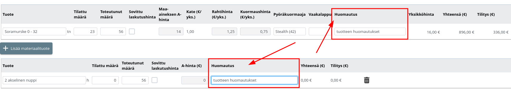 - [Uusi] Tilausten hallinta, Työmaatilaukset: Lisätty tilauksen muokkausnäkymään Tuotteen huomautus -kenttä.