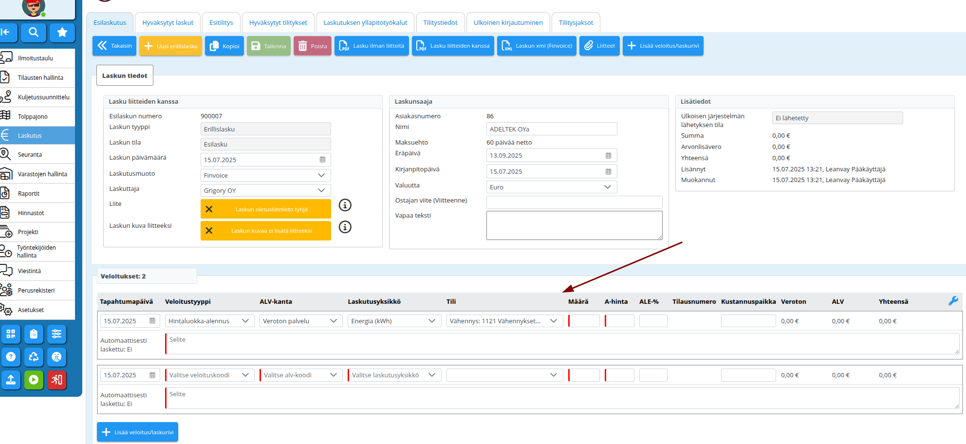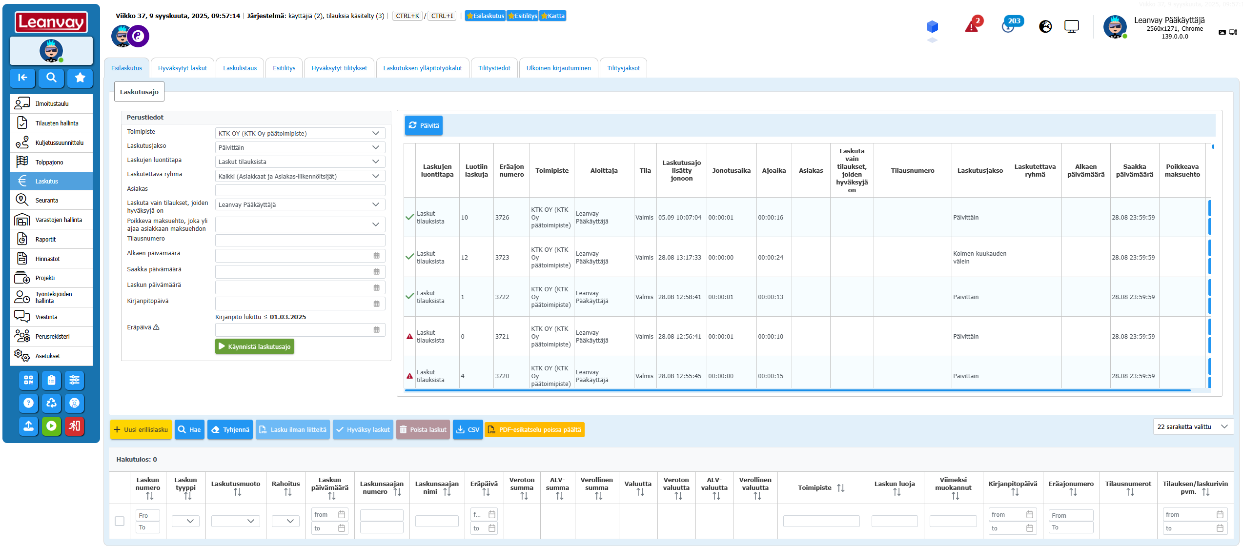 - [Muutos] Laskutus, Esilaskutus: Laskurivit muutettu taulukoksi.