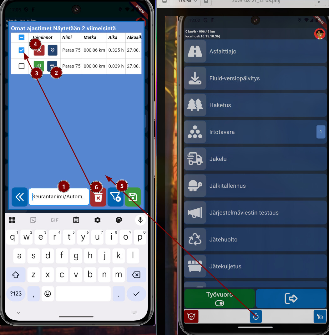 - [Uusi] Lisätty mahdollisuus luoda ajastimia. 1) Nimi. Jos jätetään tyhjäksi niin syntyy automaattinen nimi. Ajastin lähtee käyntiin vihreästä tallenna-napista. 2) Näytä ajastimen ajoreitti (kartalla). 3) Kopioi ajastin. 4) Lopeta käynnissä oleva ajastin. 5) Näytä kaikki lopettamattomat. 6) Poista ajastin. Painike näkyy, jos rivi on valittu.