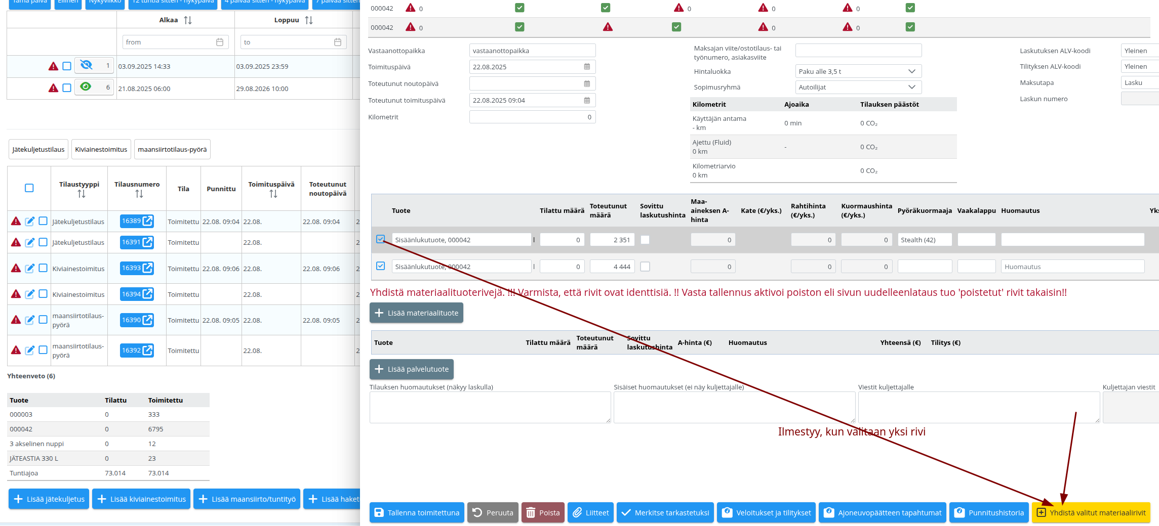 - [Uusi] Tilausten hallinta, tilauksen muokkaus: Lisätty materiaalituotteiden yhdistäminen työmaatilaukselle. Yhdistämisnappi tulee näkyviin, kun tuoterivejä valitsee.
