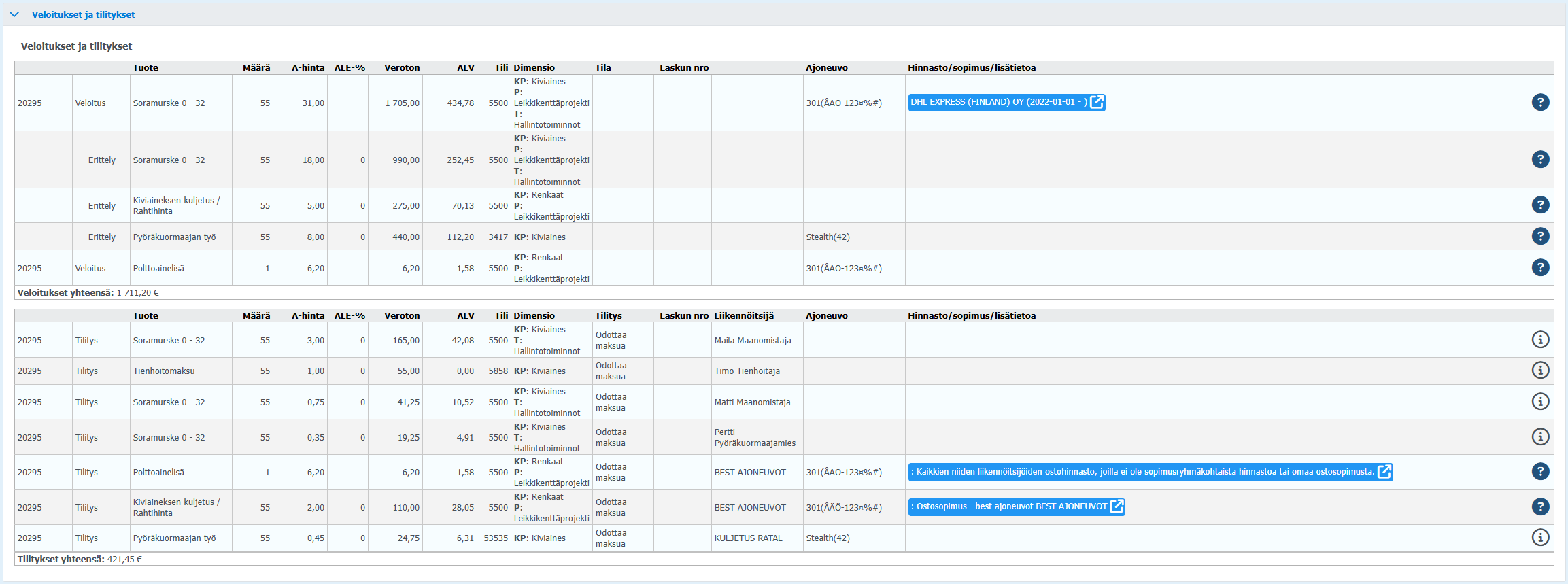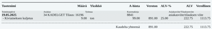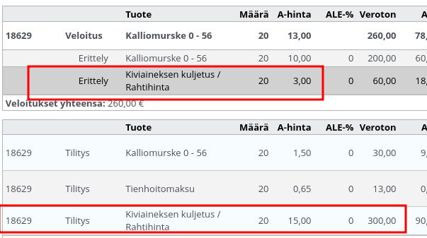 - [Korjaus] Kiviainestoimituksessa tietyissä tapauksissa palvelutuote tilitettiin pyöräkuormaajan liikennöitsijälle, vaikka olisi pitänyt tilittää kuljetuskaluston liikennöitsijälle.