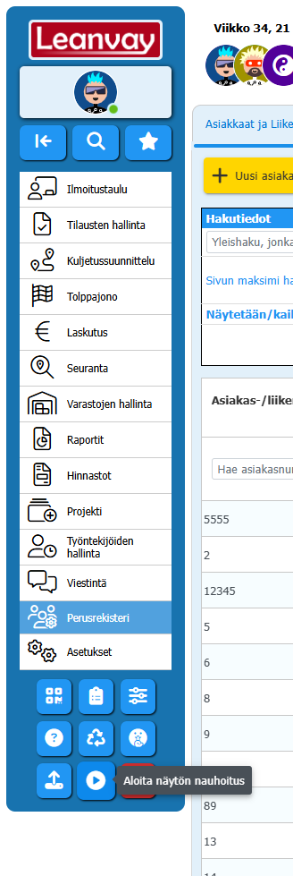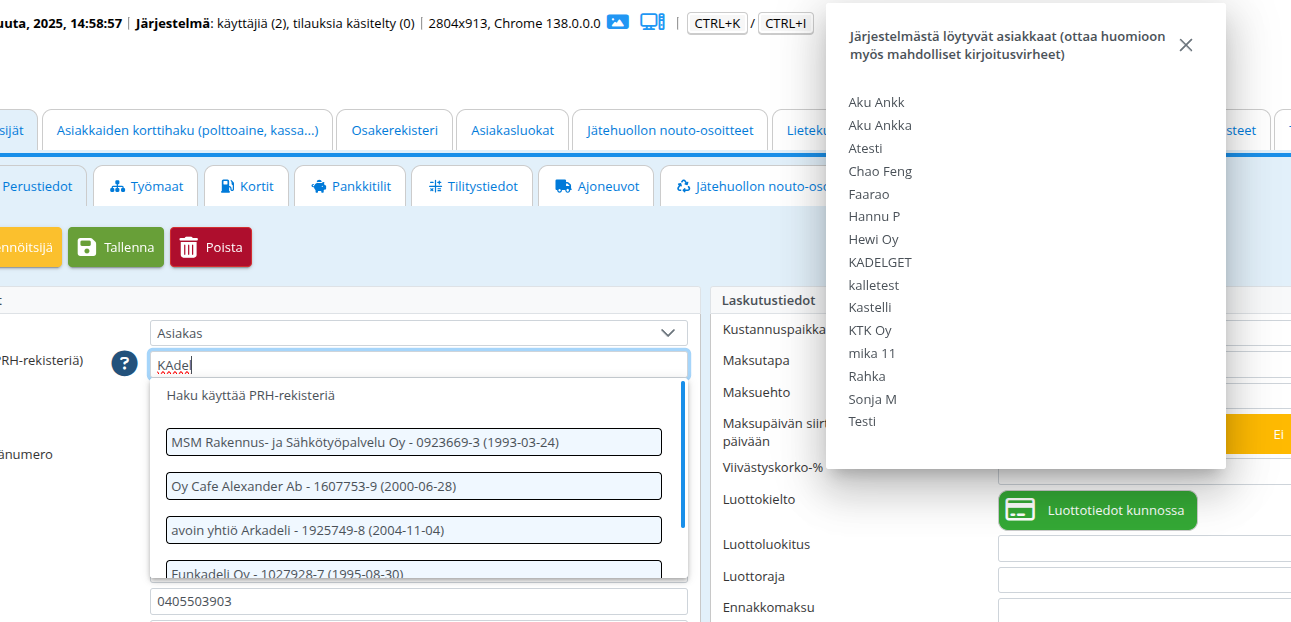 - [Uusi] Perusrekisteri, Asiakkaat: Näytetään PRH-haun kanssa olemassa olevat asiakkaat (ottaa huomioon kirjoitusvirheet).