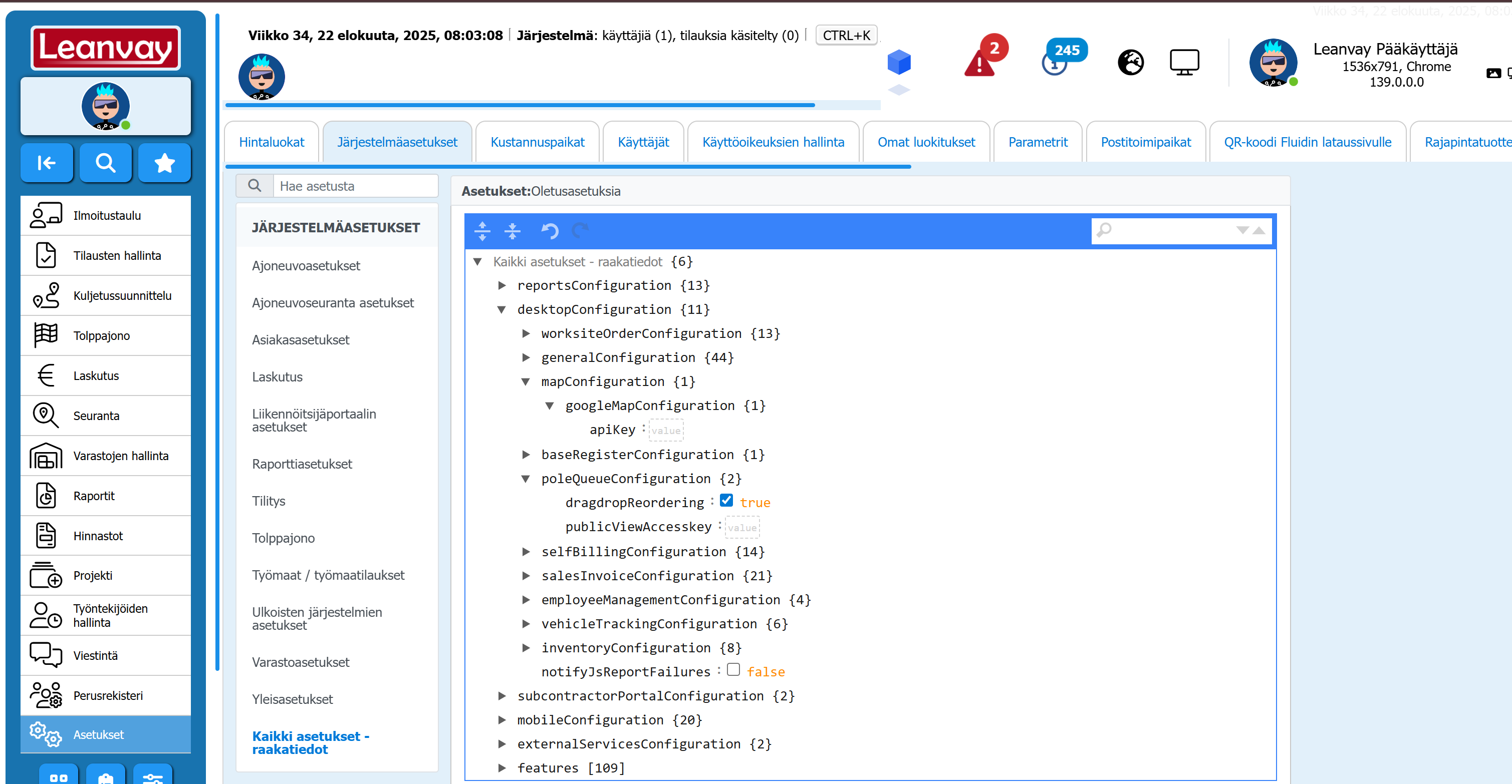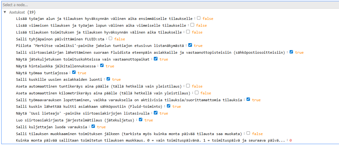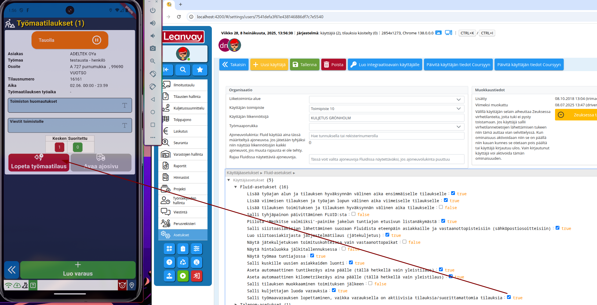 - [Uusi] Asetukset, Käyttöoikeuksien hallinta: Mahdollista laittaa Fluid-käyttäjälle päälle valinta, että työmaatilauksen varauksen saa lopettaa, vaikka tilauksia on kesken. Vaatii Fluidista vähintään version 185 toimiakseen.