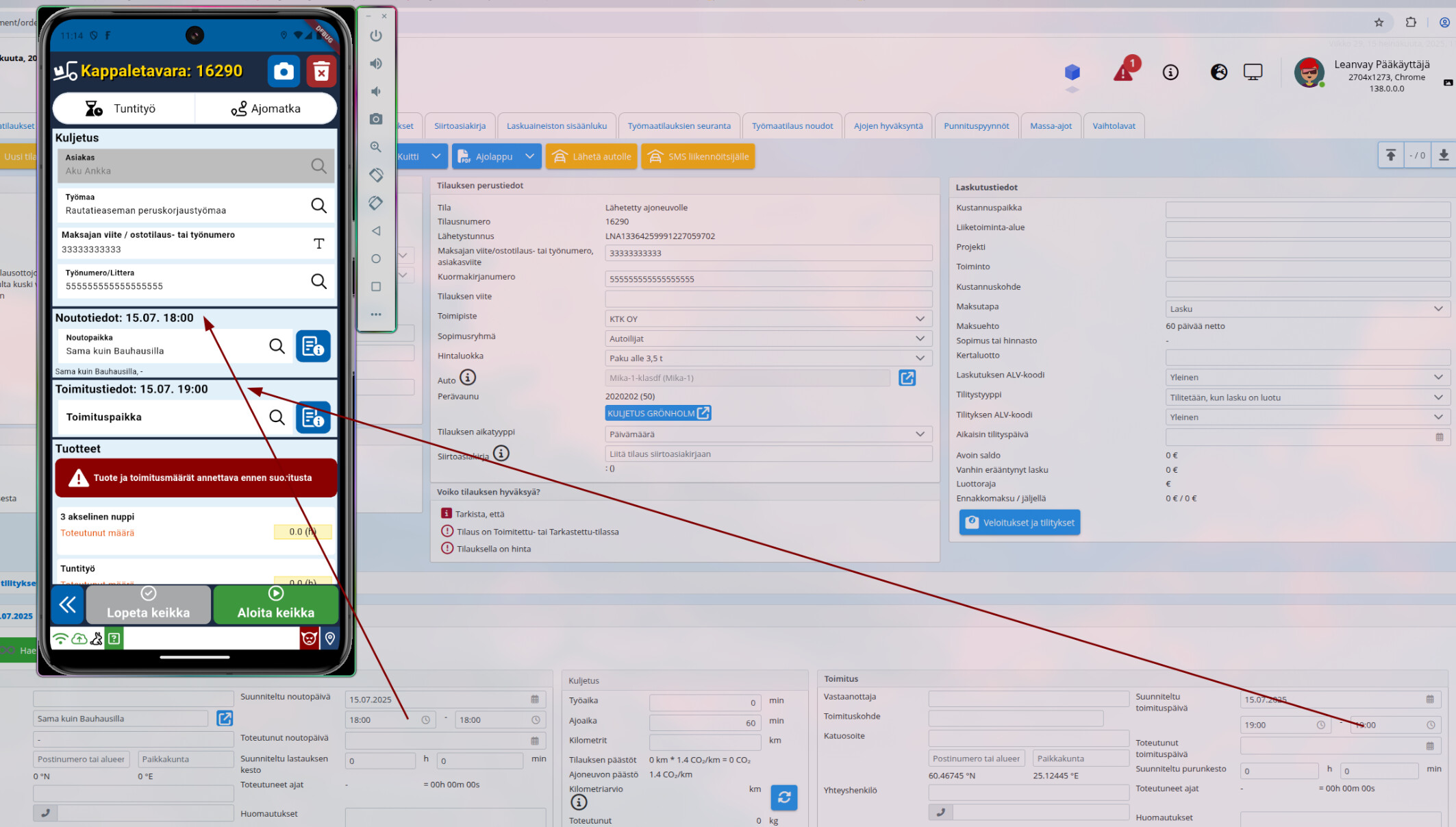 - [Muutos] Tilausten Nouto- ja Toimitusajan näyttämisen muutos: 1) Nouto: käytetään suunnitellun noutopäivän aloituskellonaikaa, 2) Toimitus: käytetään suunnitellun toimituspäivän lopetuskellonaikaa.