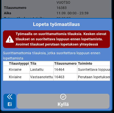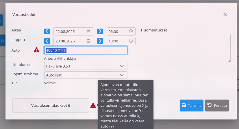 - [Uusi] Tilausten hallinta, Työmaatilaukset: Lisätty varoitus, jos varauksen autoa vaihdetaan tilausten luonnin jälkeen.