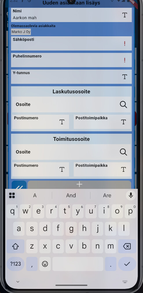- [Muutos] Uuden asiakkaan lisääminen: Lisätty laskutus- ja käyntiosoite. Fluid yrittää myös tutkia samankaltaisuutta, ottaa huomioon mm. kirjoitusvirheet. Esim. Marko Oy ja Aarko Oy ovat samankaltaisia.