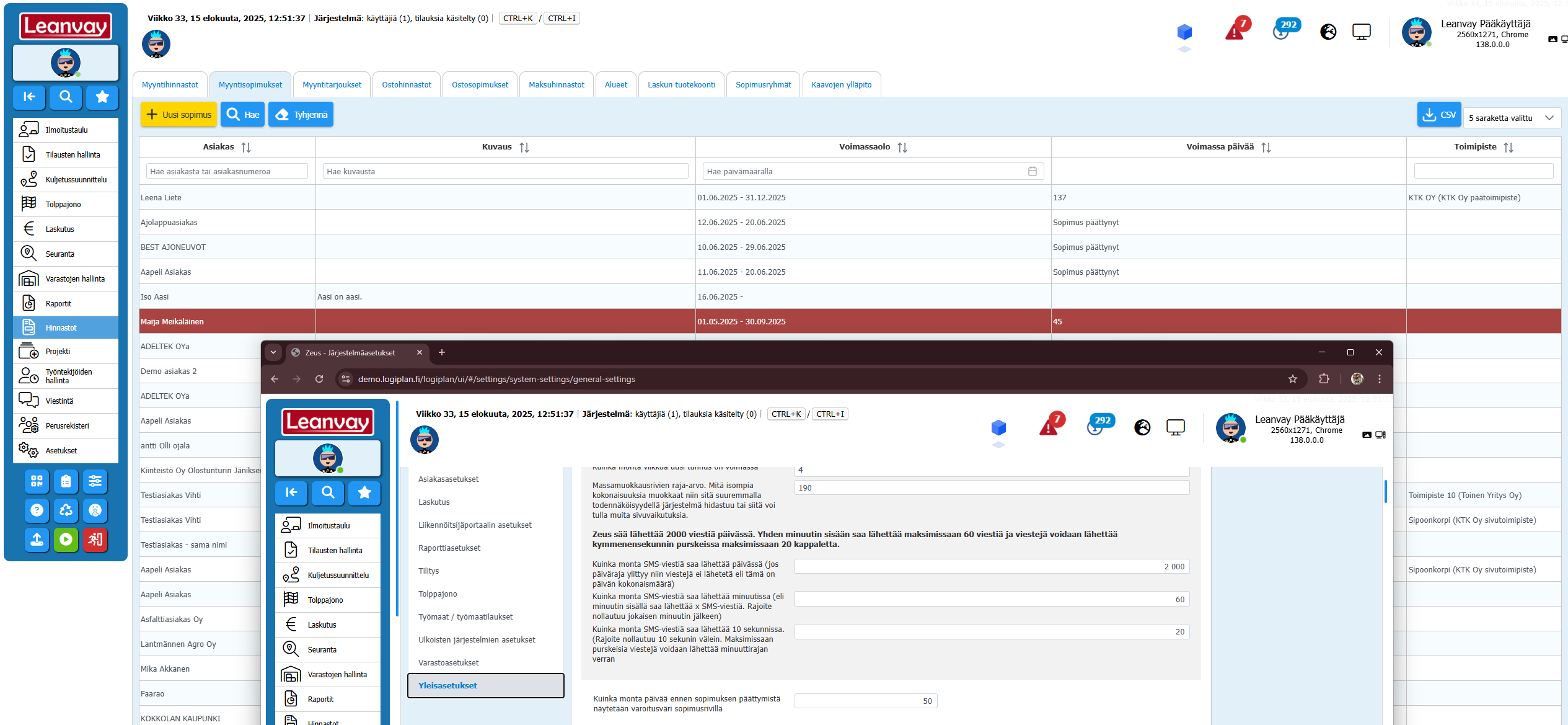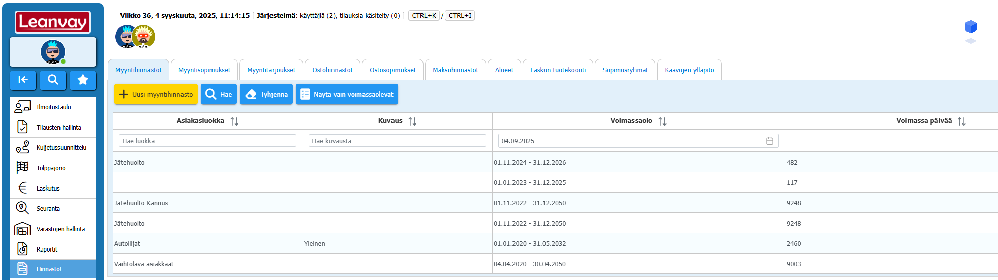 - [Uusi] Hinnastot: Mahdollista laittaa hinnastoille ja sopimuksille korostus, kun niiden voimassaoloaika on päättymässä. Valinta tehdään asetuksissa (Asetukset, Järjestelmäasetukset, Yleisasetukset).