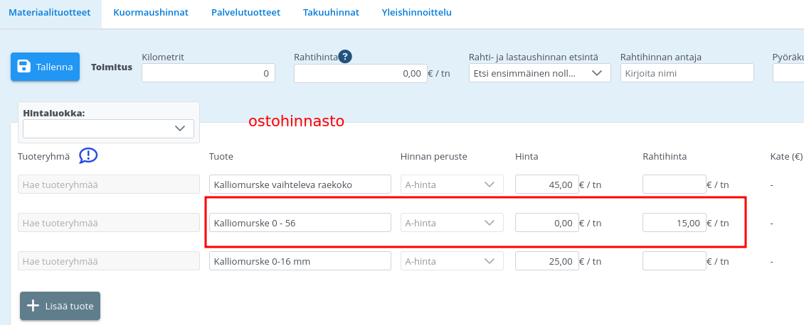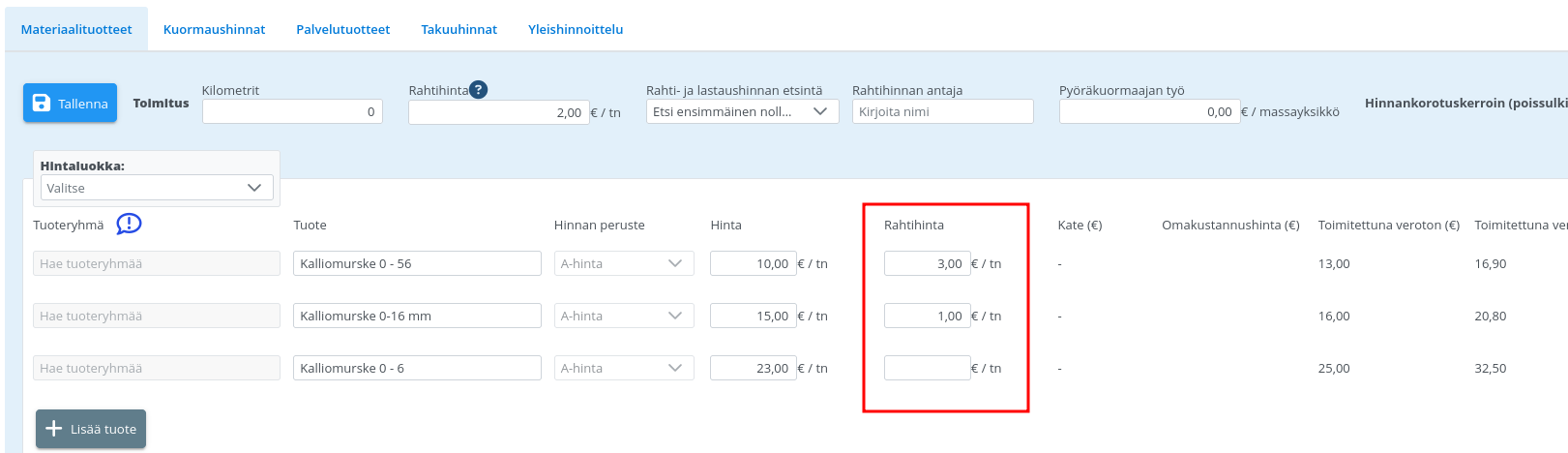 - [Uusi] Hinnastot: Lisätty mahdolliseksi lisätä rahtihinta materiaalille erikseen.