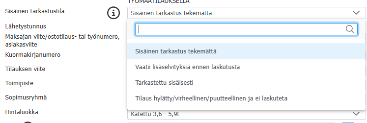 - [Uusi] Lisätty sisäisen prosessin kommunikointiin “Sisäinen tarkastus”. Laitetaan näkyviin käyttöoikeusryhmien kautta (Asetukset, Käyttöoikeuksien hallinta, Yksittäiset HMTL-lohkot/osiot, Tilauksen muokkaus: Sisäinen tarkastuskenttä).