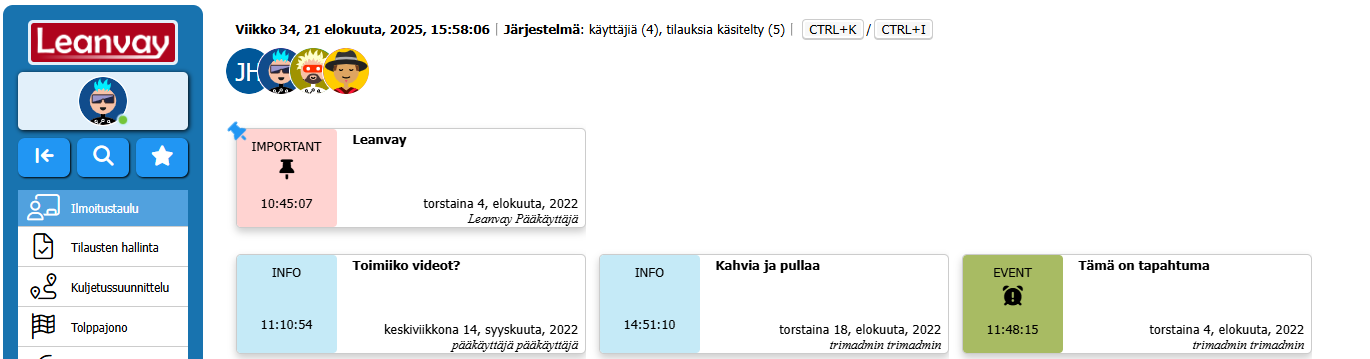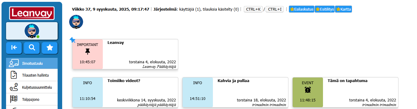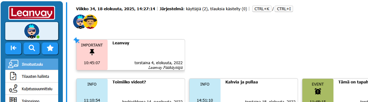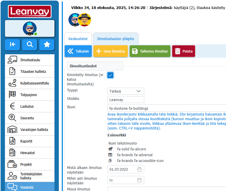 - [Muutos] Ilmoitustaulu: Tuotu ilmoitustaulun ylläpidon puolelle mahdollisuus tehdä ns. kiinnitettyjä ilmoituksia. Ne näytetään ylimpänä ja merkitään nastaikonilla. Samalla parannettu ilmoitustaulun näyttämistä pienemmillä näytöillä.