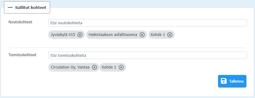 - [Muutos] Tilausten hallinta, Työmaatilaukset: Poistettu rajoitukset Sallitut kohteet -valinnoista, eli voi valita mitä tahansa kohteita. Huom: Tämä näkyy lähinnä Fluidissa, eli kuljettaja voi valita tilaukselle sallittujen kohteiden listalta juuri ne kohteet, mitä siellä on tarjolla, vaikka Zeuksessa ei voisikaan (esim. työmaan kohde vastaanottopaikaksi, kuten kuvassa on sallittu).