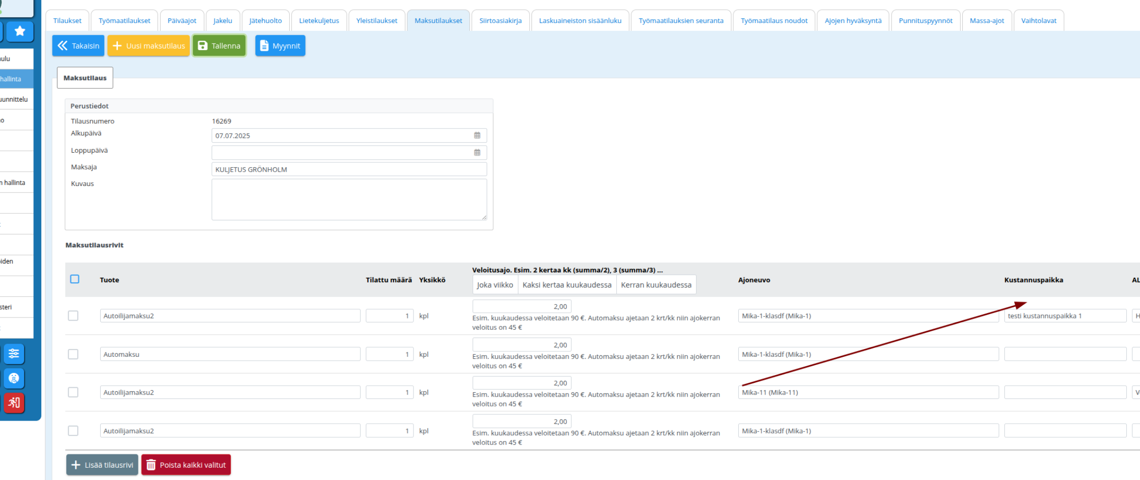 - [Muutos] Tilausten hallinta, Maksutilaukset: Muutettu näkymää helpommin hahmotettavaksi ja lisätty maksutilausriville Kustannuspaikka-sarake.