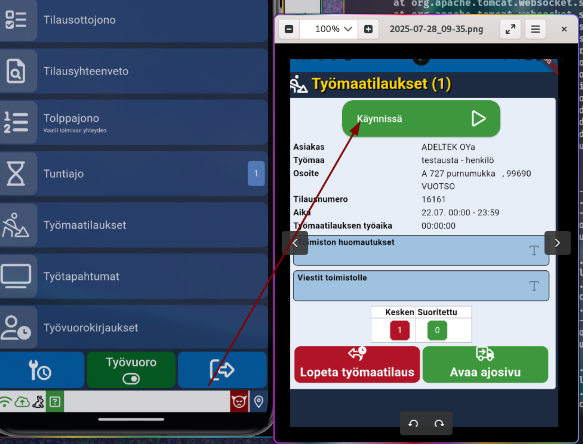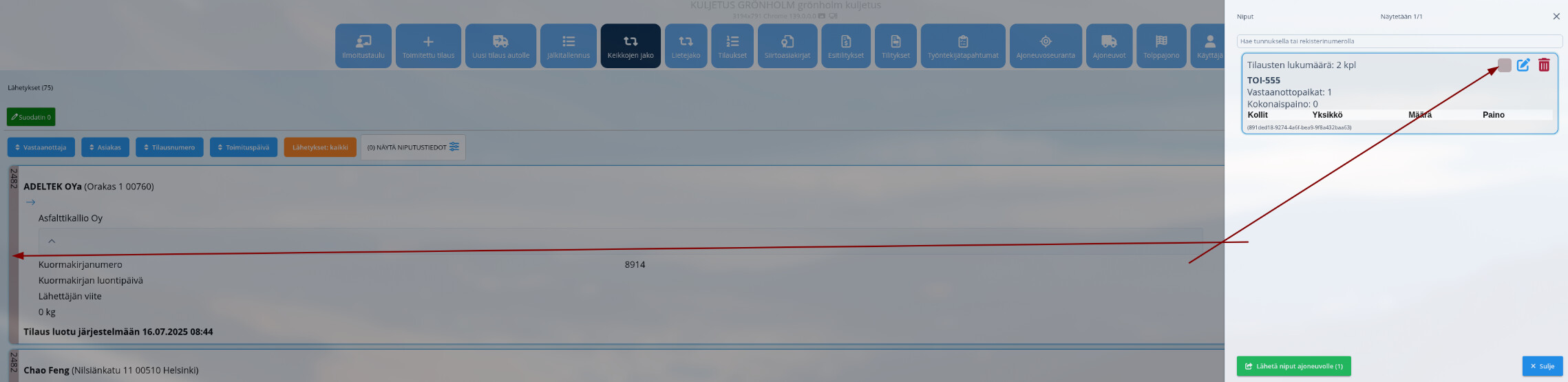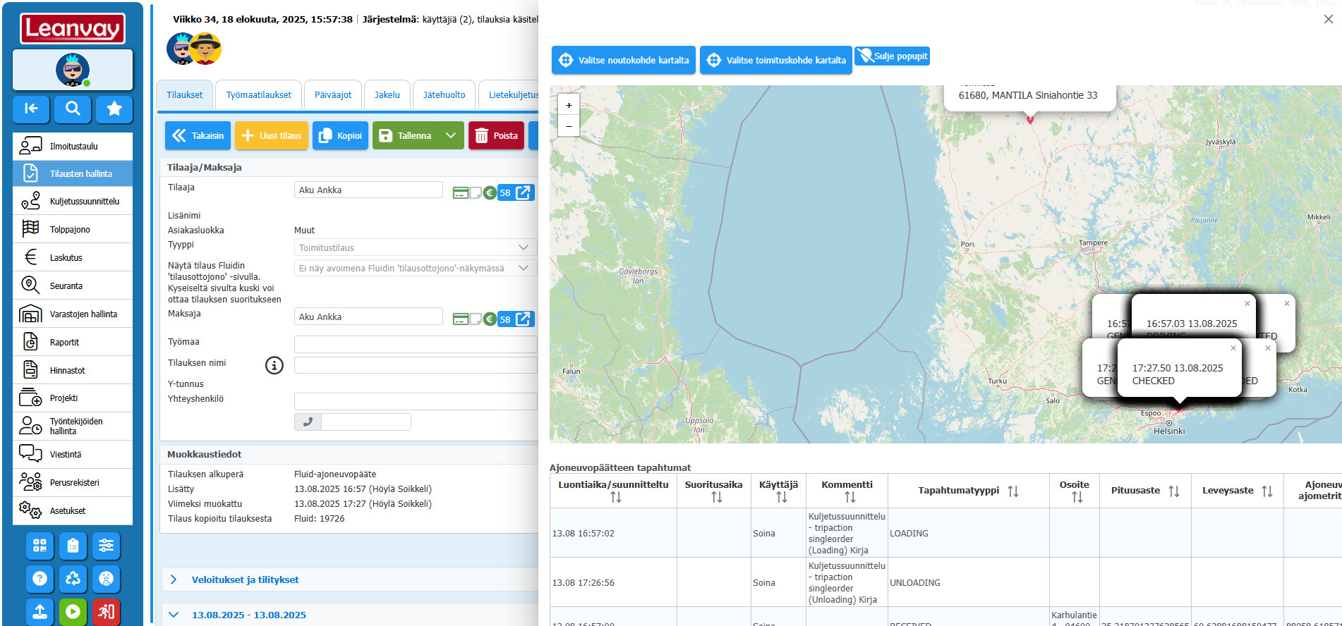 - [Muutos] Tilausten hallinta, tilauksen muokkausnäkymä: Siirretty kartta ilmestymään oikealta, kun nappia painaa. Poistettu aikaisempi paneelissa ollut kartta.