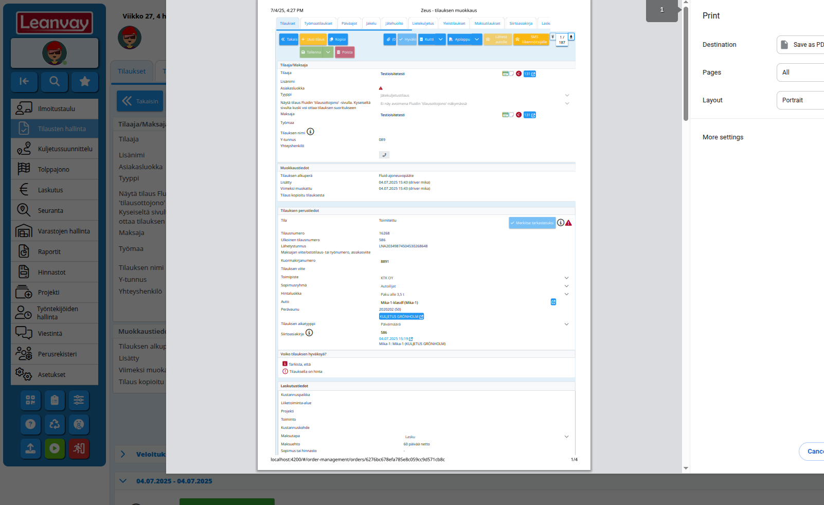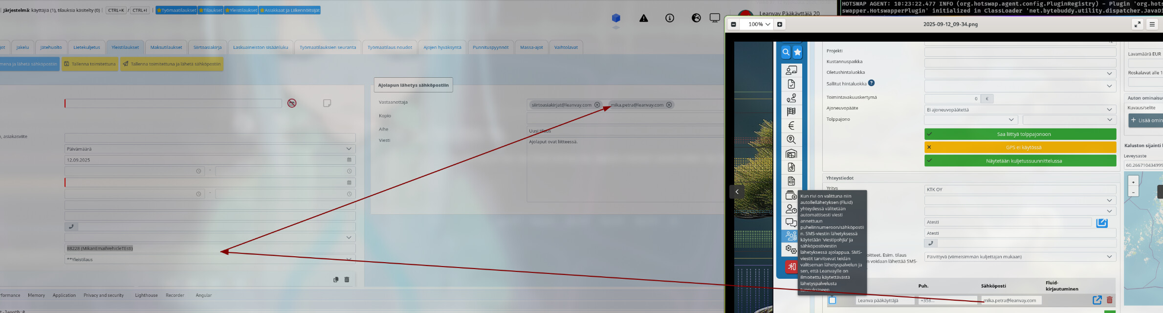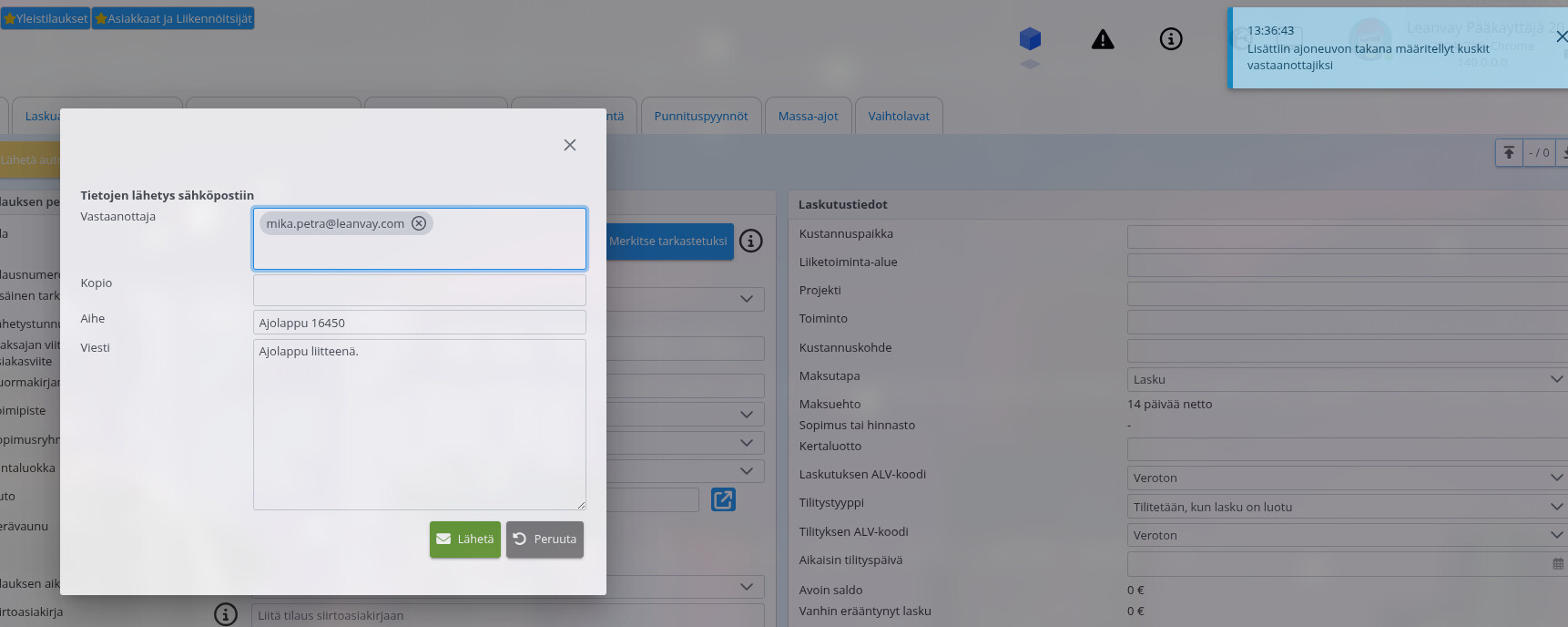 - [Uusi] Tilausten hallinta, tilauksen muokkaus: Lisätty ajolapun lähettäminen sähköpostiin. Järjestelmä lisää automaattisesti ajoneuvon taakse lisätyt kuljettajien sähköpostiosoitteet. Niille, jotka on merkitty aktiivisiksi, lähtee ajolappu automaattisesti sähköpostiin, kun tilaus lähetetään Zeuksesta Fluidiin.