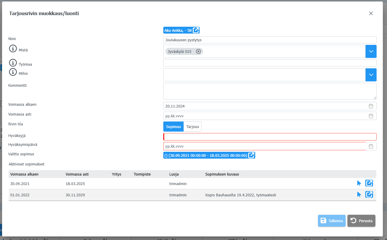 - [Muutos] Hinnastot, Myyntitarjoukset: Kun muokkaa tarjousriviä ja vaihtaa sen tilan sopimukseksi, niin alle tulee näkyviin kaikki ko. asiakkaan olemassa olevat aktiiviset myyntisopimukset, jotka ovat voimassa tarjousrivin voimassaoloaikana. Aktiiviset myyntisopimukset näytetään riveinä, joiden oikeassa reunassa olevat ikonit valitsevat rivin (nuoli) ja avaavat myyntisopimuksen uuteen ikkunaan (laatikkonuoli). Kun valitsee mihin myyntisopimukseen tarjousrivin haluaa liittää, tulee se näkyviin “Valittu sopimus” -kohtaan.