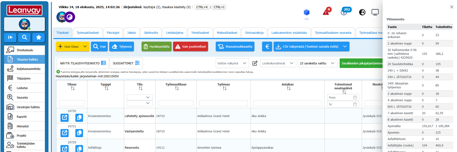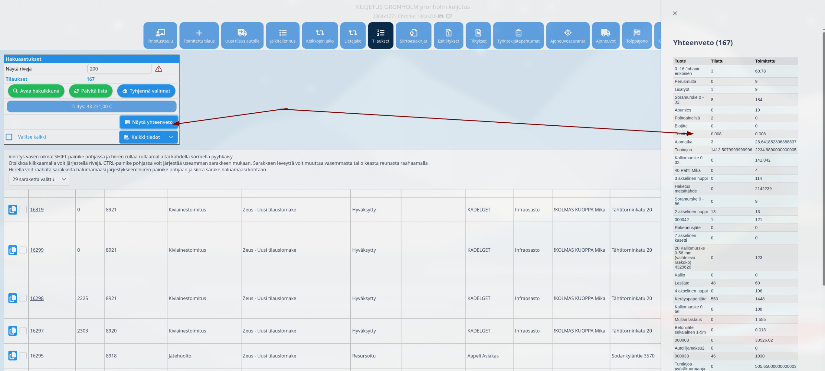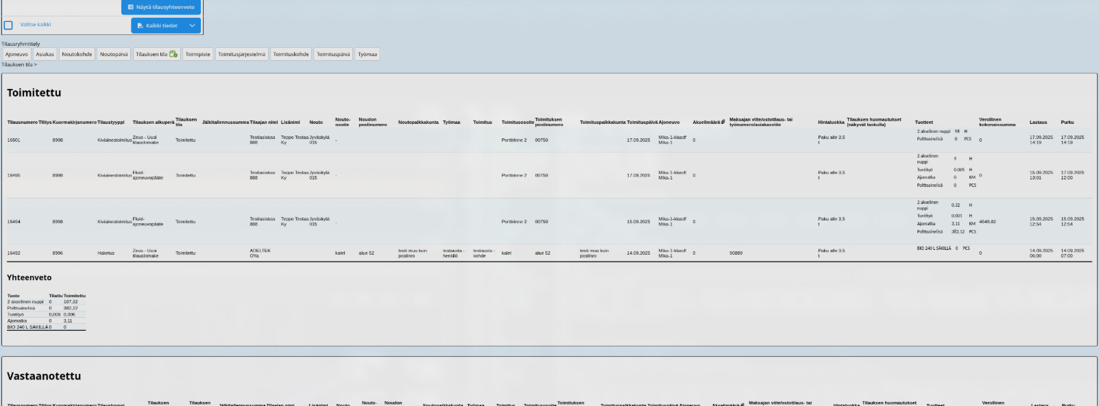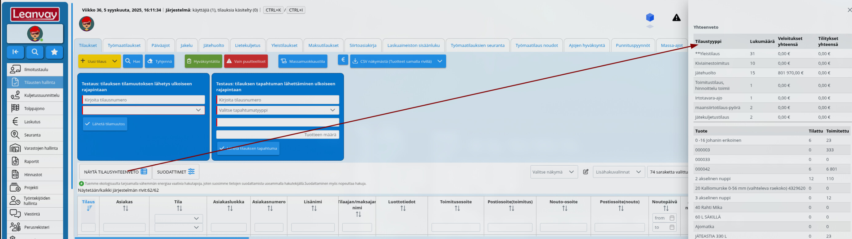 - [Uusi] Tilausten hallinta: Lisätty “Näytä tilausyhteenveto” -nappi, jota painamalla saa listalle suodatetut tilaukset yhteenvetona näkymän oikeaan reunaan.