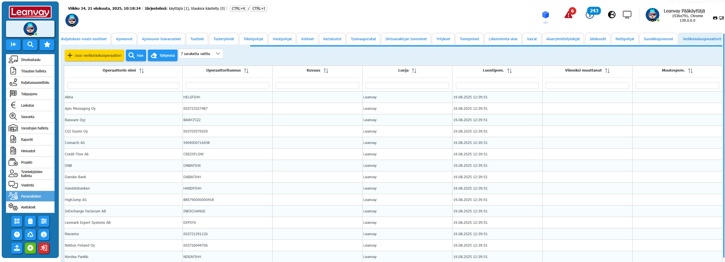 - [Uusi] Perusrekisteri, Verkkolaskuoperaattorit: Lisätty verkkolaskuoperaattoreille oma hallintasivu. Laitettava käyttöoikeusryhmälle näkyviin (Asetukset, Käyttöoikeuksien hallinta).