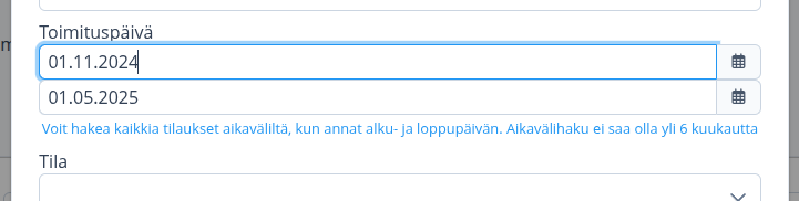 - [Muutos] Tilausten lista: Lisätty hakuun maksimihakuvälin selite ja esto yli 6 kuukautta vanhojen näyttämiselle.