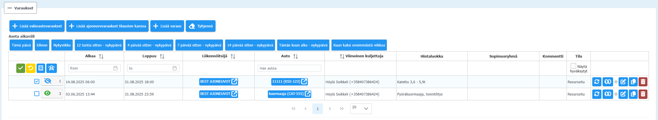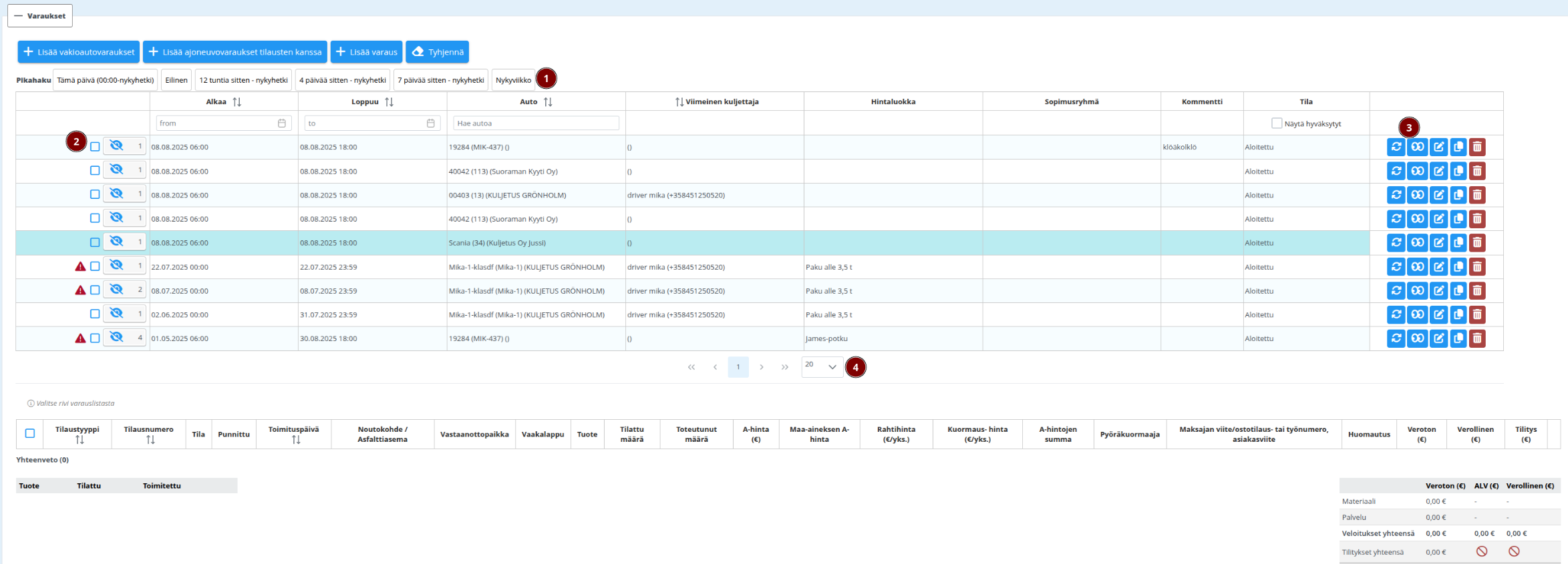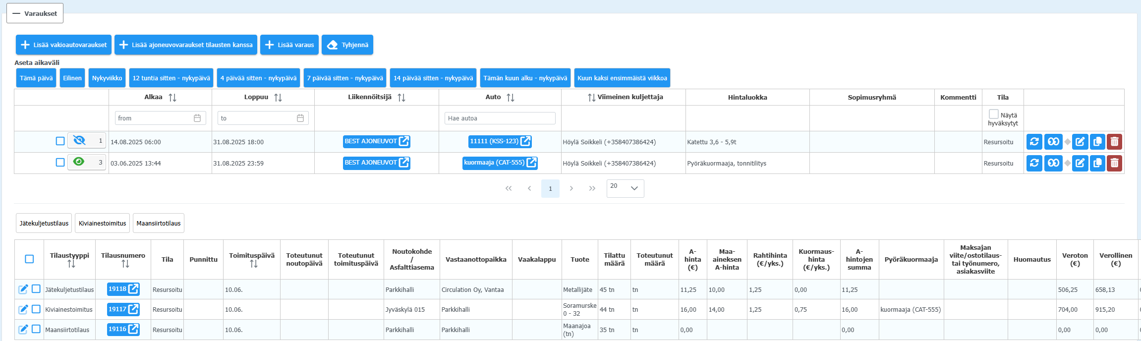 - [Uusi] Tilausten hallinta, Työmaatilaukset: Poistettu vanha näkymä, lisätty aikavälihakuja, uudistettu varausten taulukko, lisätty sivutus sekä lisätty auton viimeinen kuljettaja ja puhelinnumero. HUOM: Varauksen tilaukset saa näkyviin kun painaa varauksen riviltä silmää! Oletuksena silmä on kiinni = varauksen tilaukset eivät näy. Varauksen tilausten lukumäärä näytetään silmän vieressä.