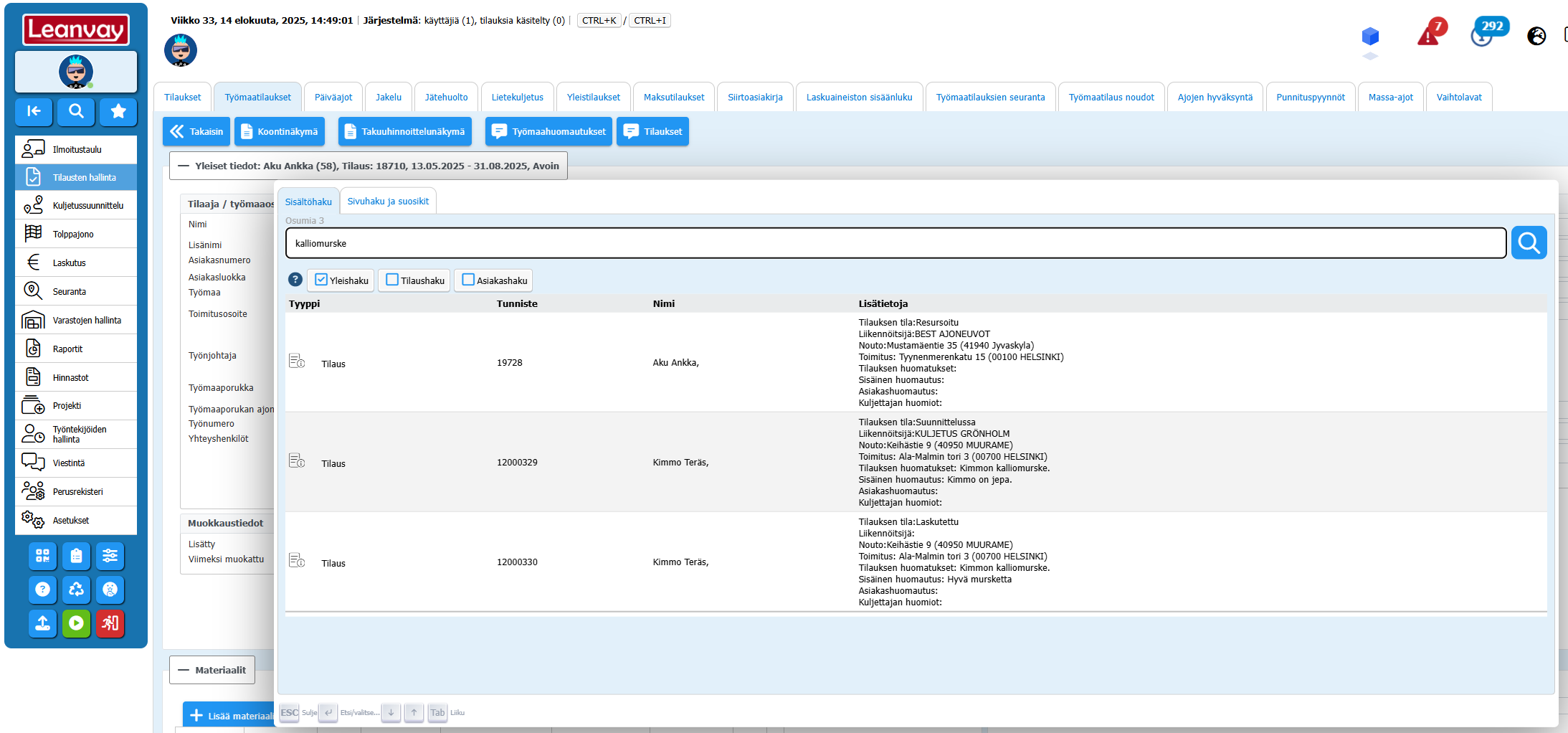 - [Uusi] Sisältöhaku: Muokattu alareunan nappeja ja asetettu perustiedot asiakkaille ja tilauksille (haut tarkentuvat, kun tietoa kertyy lisää). Sisältöhaku aukeaa vasemman navigaation suurennuslasinapista ja tekee haun enteriä painamalla. Hakuikkunaa voi raahata haluamaansa paikkaan. Haku suljetaan näppäimistön ESC-napista.