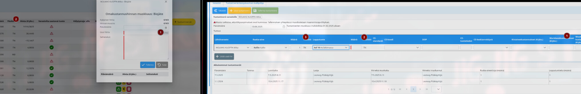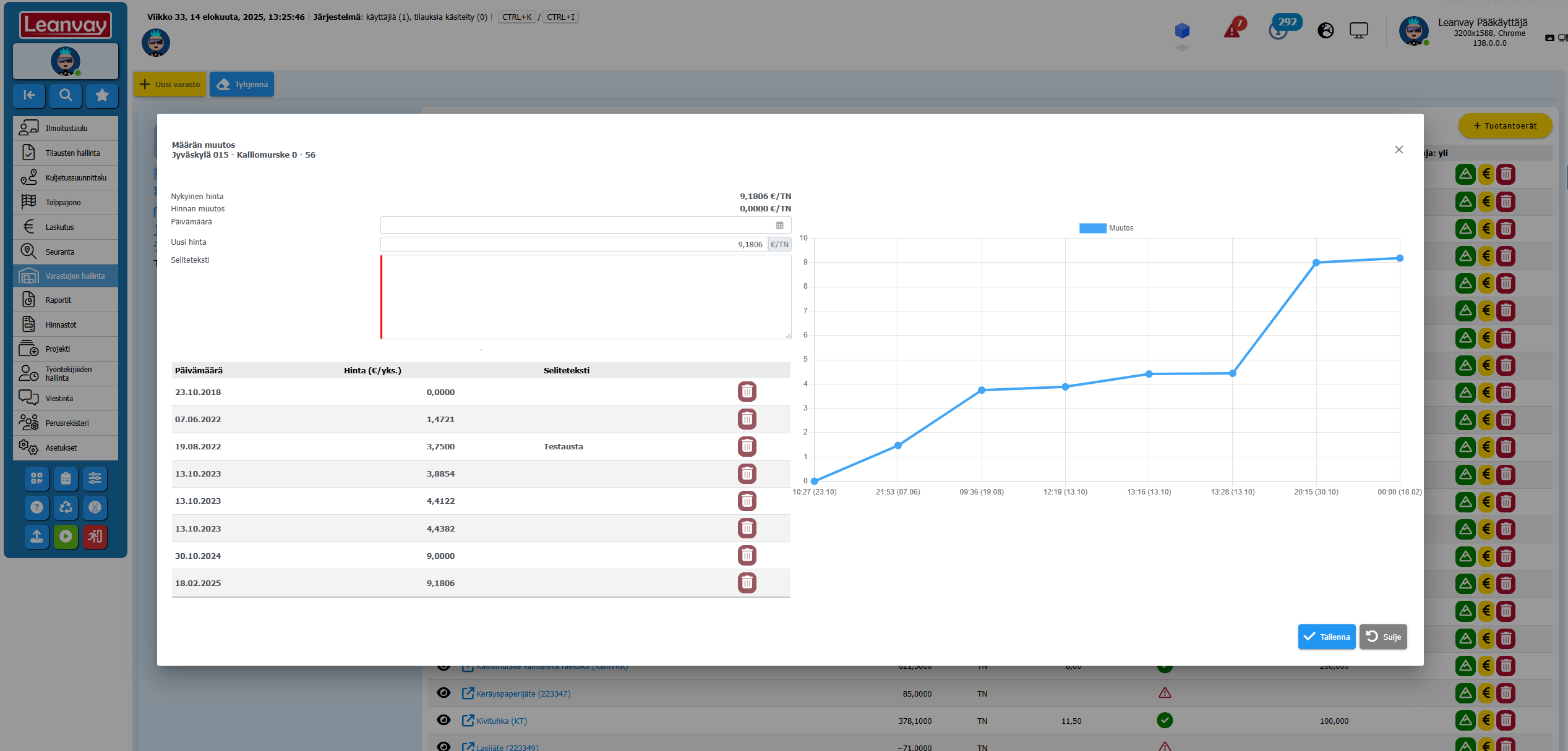 - [Uusi] Varastojen hallinta: Lisätty hinnanmuutosgraafi. Kun varastojen listasivulta painaa tuotteen kohdalta keltapohjaista €-nappia (omakustannushinnan muokkaus), näkyy kenttien oikealla puolella nyt myös graafi hinnanmuutoksesta.