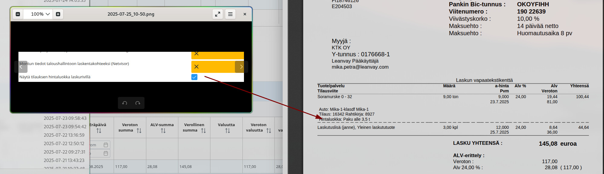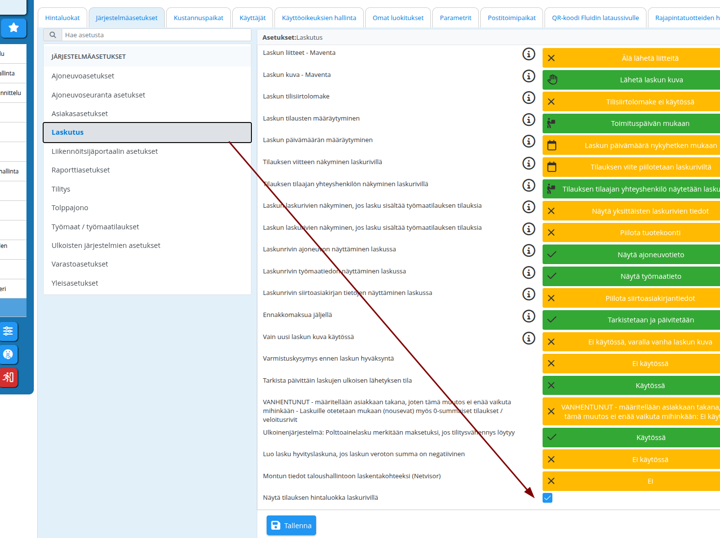- [Uusi] Laskutus: Mahdollista laittaa asetuksista (Asetukset, Järjestelmäasetukset, Laskutus) päälle hintaluokan näyttäminen laskulla. Huom: “FINVOICE_WITH_INVOICEROWS” -ominaisuus oltava päällä eli näytä laskurivit laskulla. Voit varmistaa tämän asian LogiPlan-tuesta.