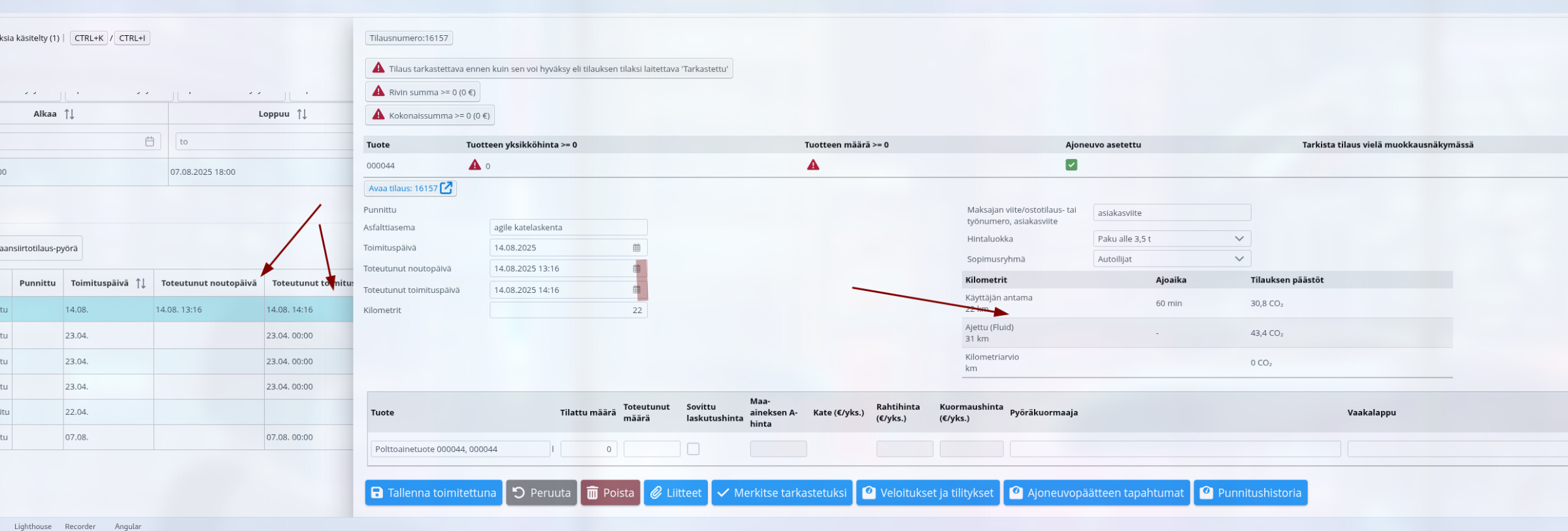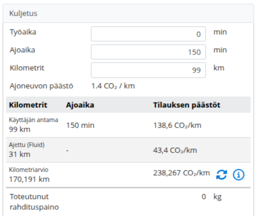 - [Muutos] Tilausten hallinta, tilauksen muokkausnäkymä: Näytetään tilauksen CO2-arvo kaikista tilauksen eri kilometriarvoista (koordinaatteihin perustuva arvio, Fluidin laskema ja käyttäjän manuaalisesti syöttämä).