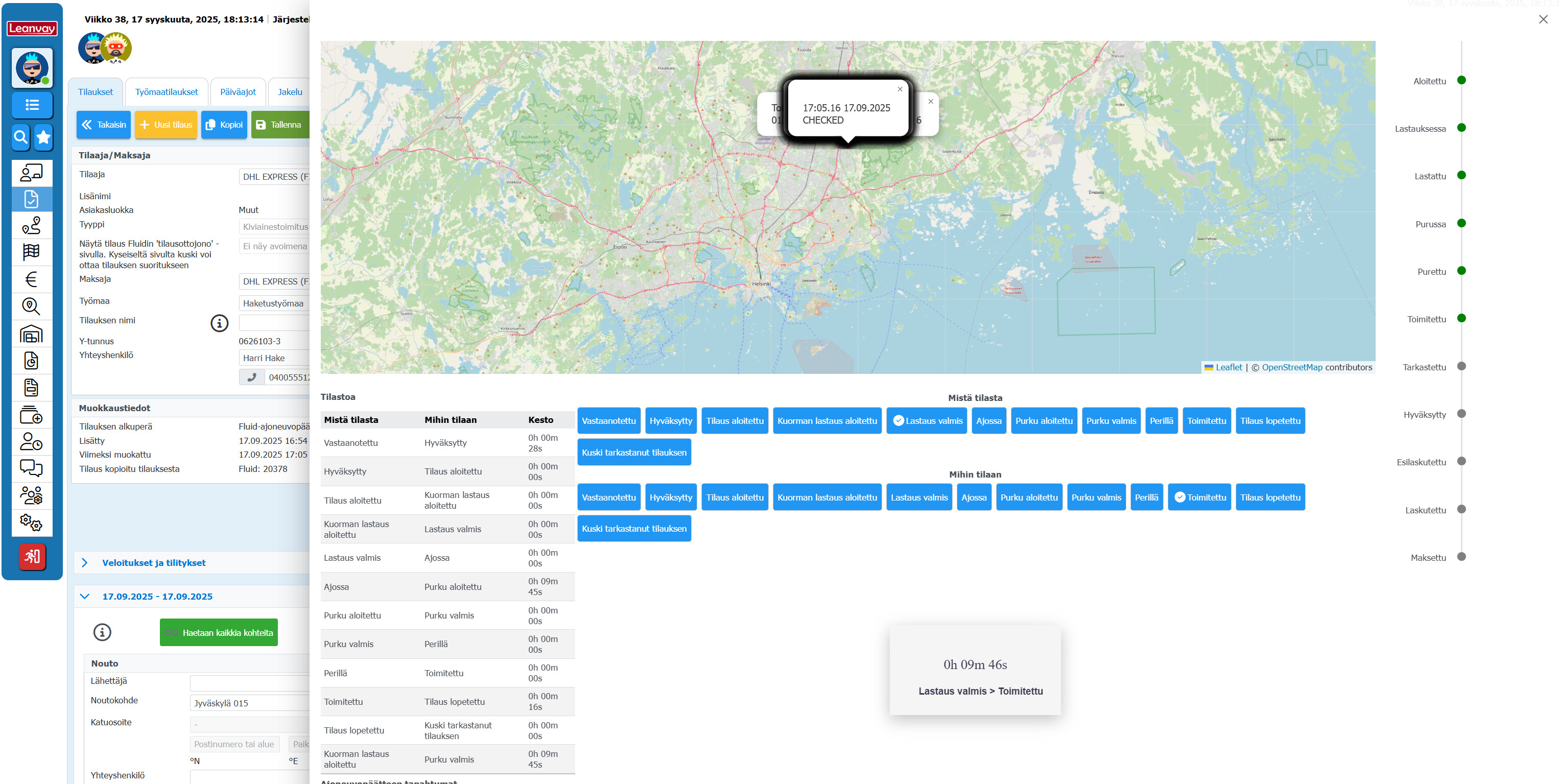 - [Uusi] Tilausten hallinta, tilauksen muokkaus: Lisätty kartan yhteyteen laskentaa tilauksen tiloista ja tapahtumista. Sinisiä nappeja painamalla saa laskennan ko. tilaväliltä. Huom: kaikissa tilaustyypeissä ei ole kaikkia tiloja.