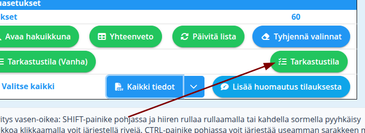 - [Muutos] Tilausten lista: Uusi Tarkastustila ei enää aukea uuteen näkymään, vaan napin painaminen muuttaa yläosan napit tarkastustilan toiminnoiksi ja näyttää vain tarkastusvalmiit tilaukset (Toimitettu-tila). Vanha tarkastustila toimii kuten aiemminkin.