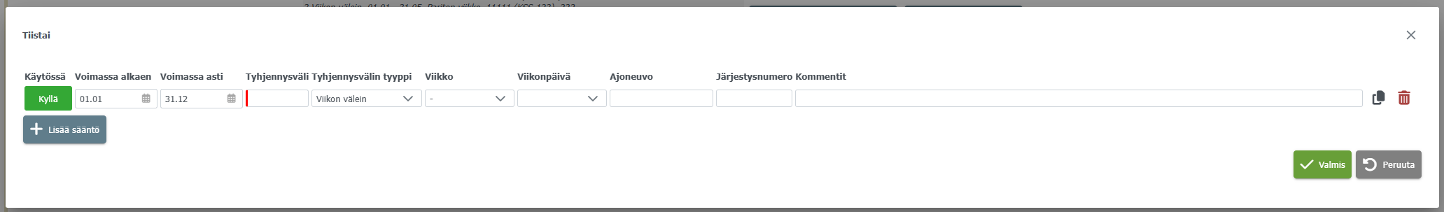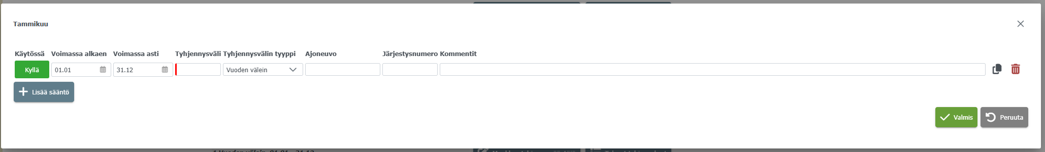 - [Muutos] Perusrekisteri, Jätehuollon nouto-osoitteet: Lisätty tyhjennyssäännön luomiseen oletuksia: yksi sääntörivi jo lisättynä/auki ja sillä voimassaoloaika 1.1.-31.12.