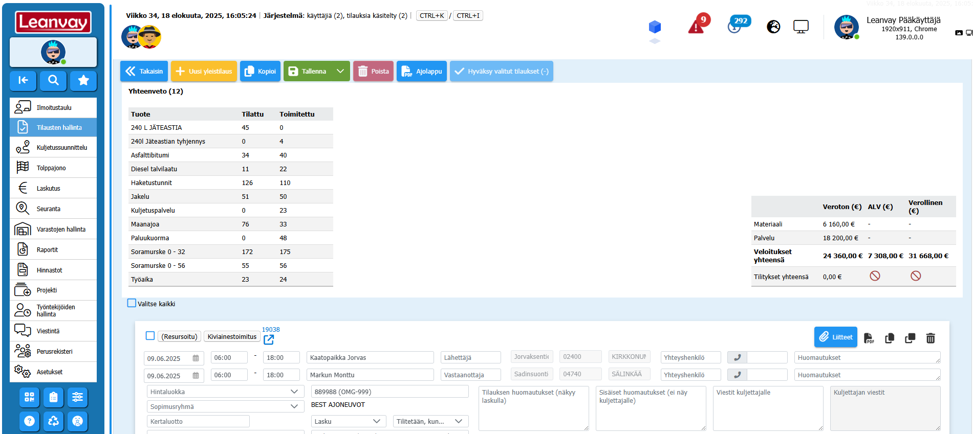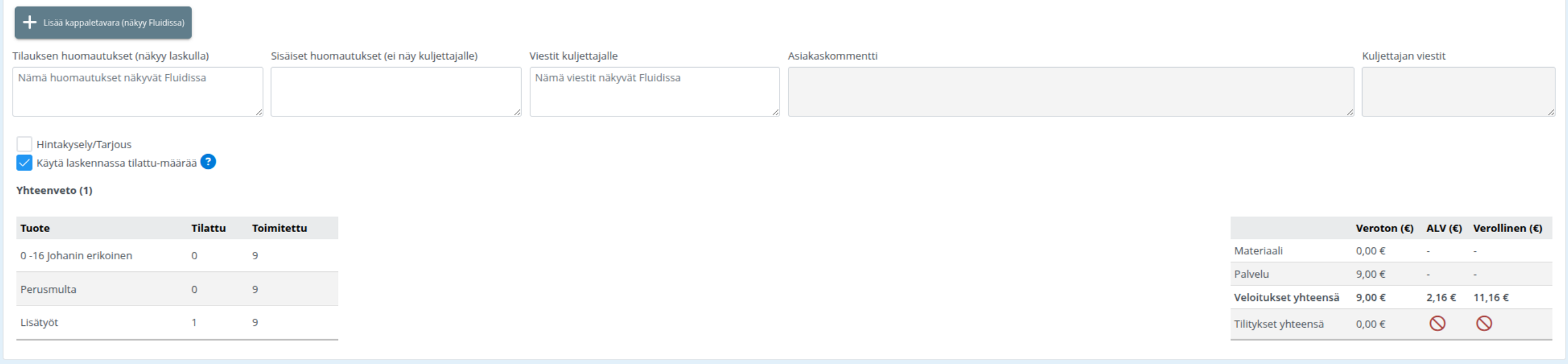 - [Muutos] Tilausten hallinta, tilauksen muokkausnäkymä: Uusittu hintakenttiä ja lisätty yhteenveto. Hinnat lasketaan tallennuksen yhteydessä.
