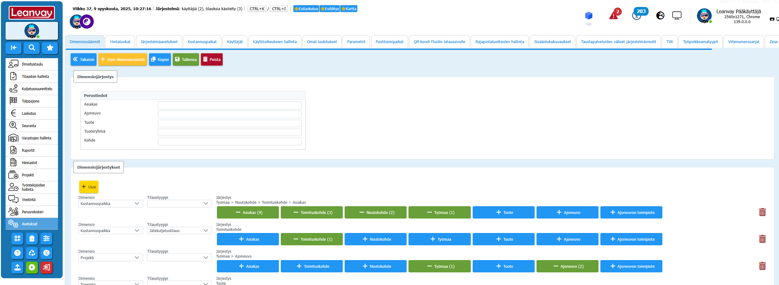 - [Muutos] Asetukset: Siirretty Dimensiosäännöt omaksi välilehdekseen, aiemmin olivat Kustannuspaikat-välilehden sisällä.