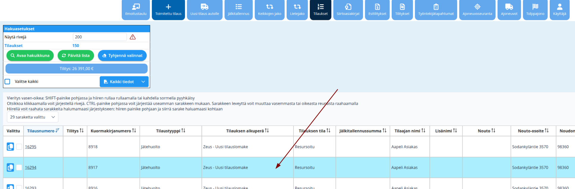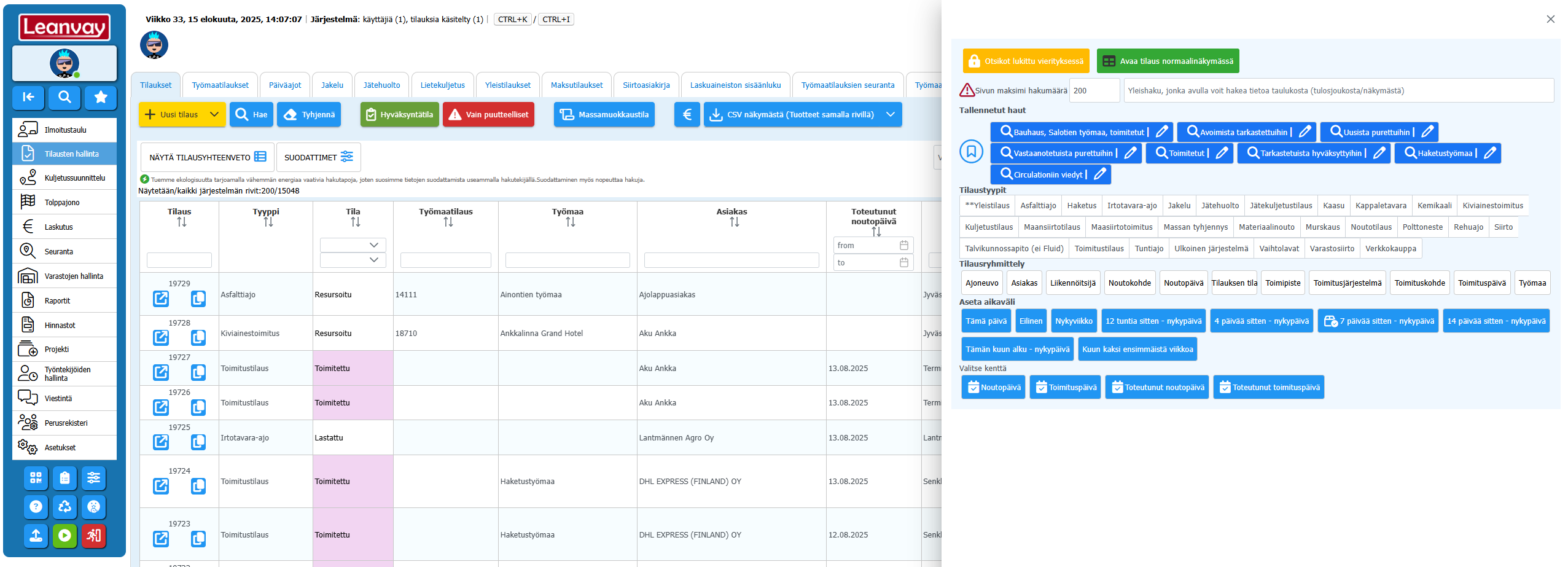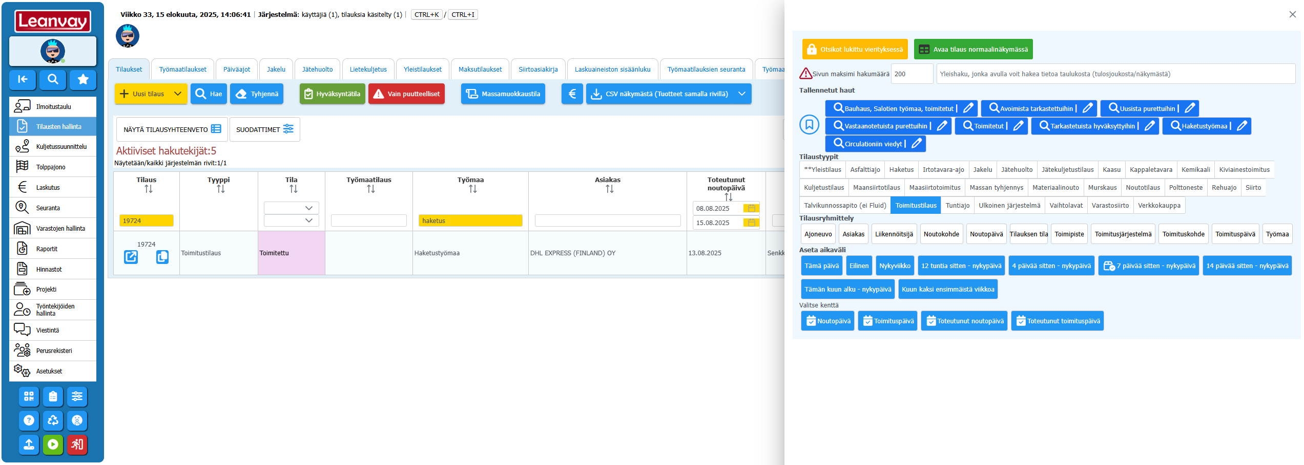 - [Uusi] Tilausten hallinta: Siirretty tilauslistan suodattimet sivupalkkiin, jotta tilauslista saisi enemmän tilaa. Tyhjennä-nappia kannattaa muistaa käyttää ahkerasti, jottei mikään aiemmin tehty suodatus enää vaikuta.
