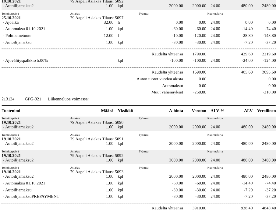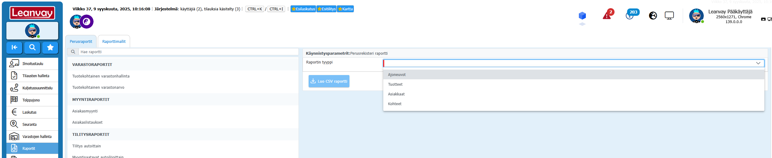 - [Uusi] Raportit: Lisätty perusrekisteriraportti, jonka voi luoda ajoneuvoista, tuotteista, asiakkaista ja kohteista.