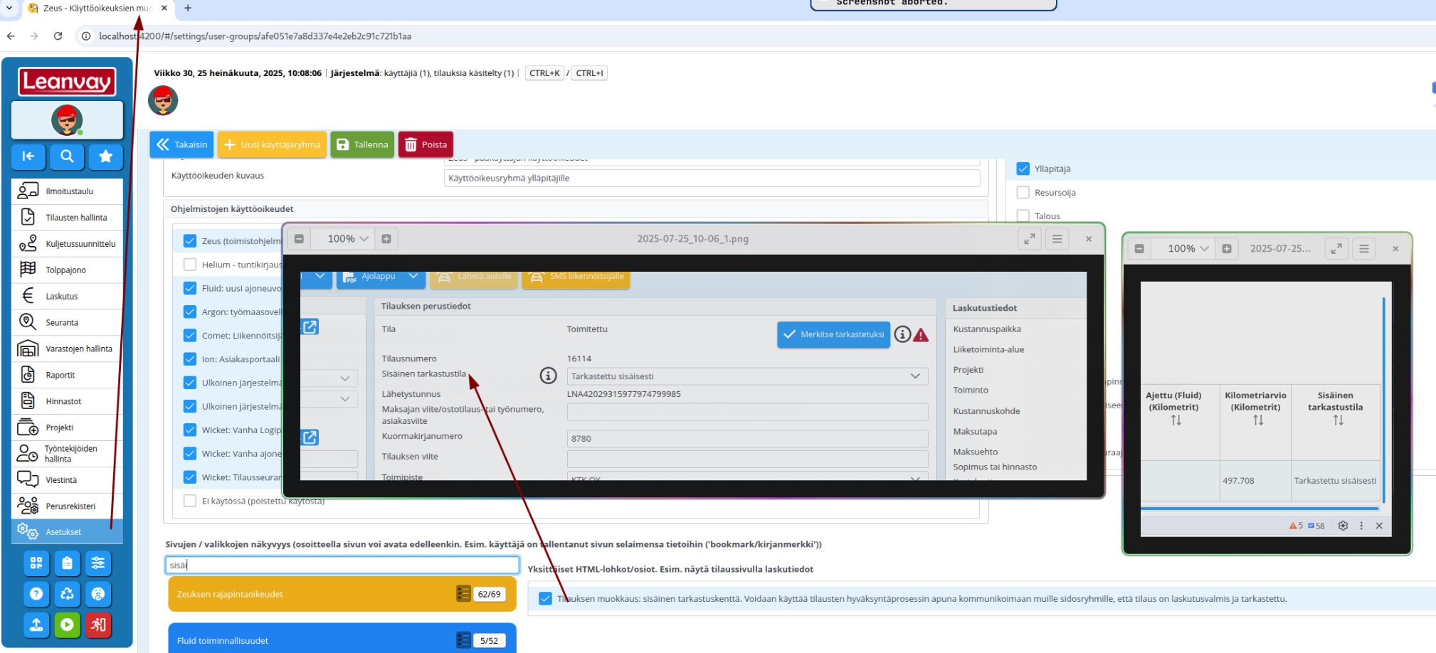 - [Muutos] Työmaatilaus: Muutettu työmaan varauksen lopettamisen yhteydessä tapahtuva keskenkeräisten tilausten automatiikka sellaiseksi, että vain aloittamattomat poistetaan, keskeneräiset pitää erikseen kuitata pois. Tällä estetään se, etteivät keskeneräiset mene vahingossa toimitetuiksi eikä toisaalta vahingossa poisteta sellaisia tilauksia, jotka olikin tarkoitus suorittaa loppuun. Laitettava päälle käyttöoikeusryhmälle Zeuksesta (Asetukset, Käyttöoikeusryhmät, Fluid-toiminnallisuudet).