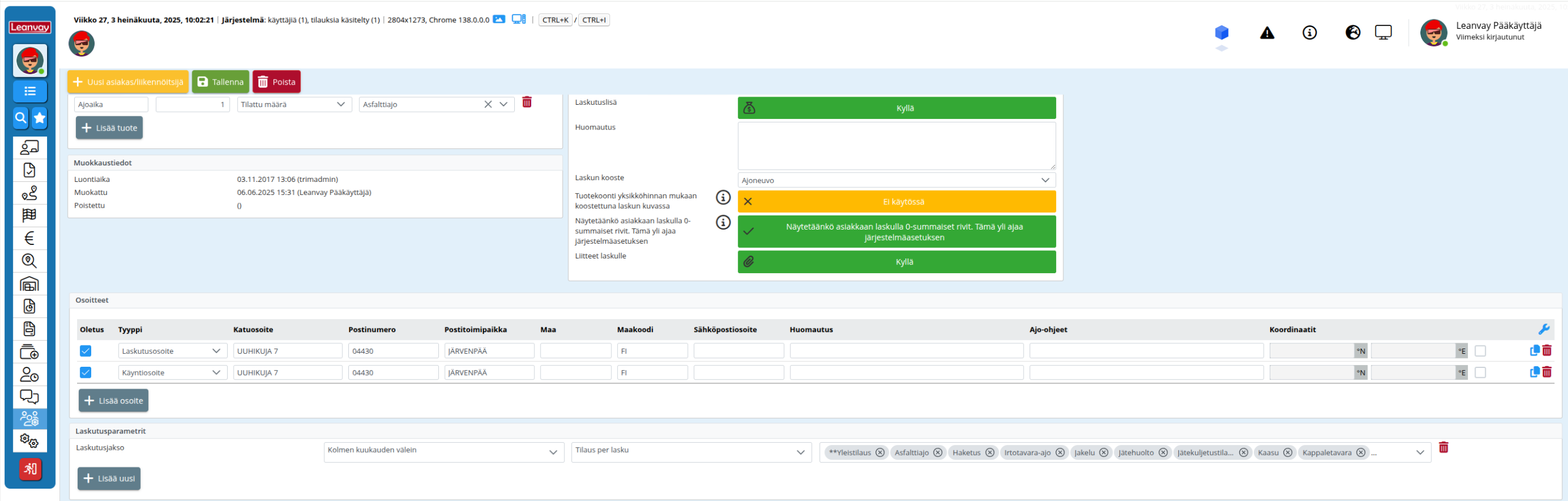 - [Uusi] Perusrekisteri, Asiakkaat: Muutettu asiakkaan osoitteiden hallintaa, tuotu mahdollisuus luoda useita erilaisia osoitteita. Samalla kaikki postiosoitteet muutettu laskutusosoitteiksi.