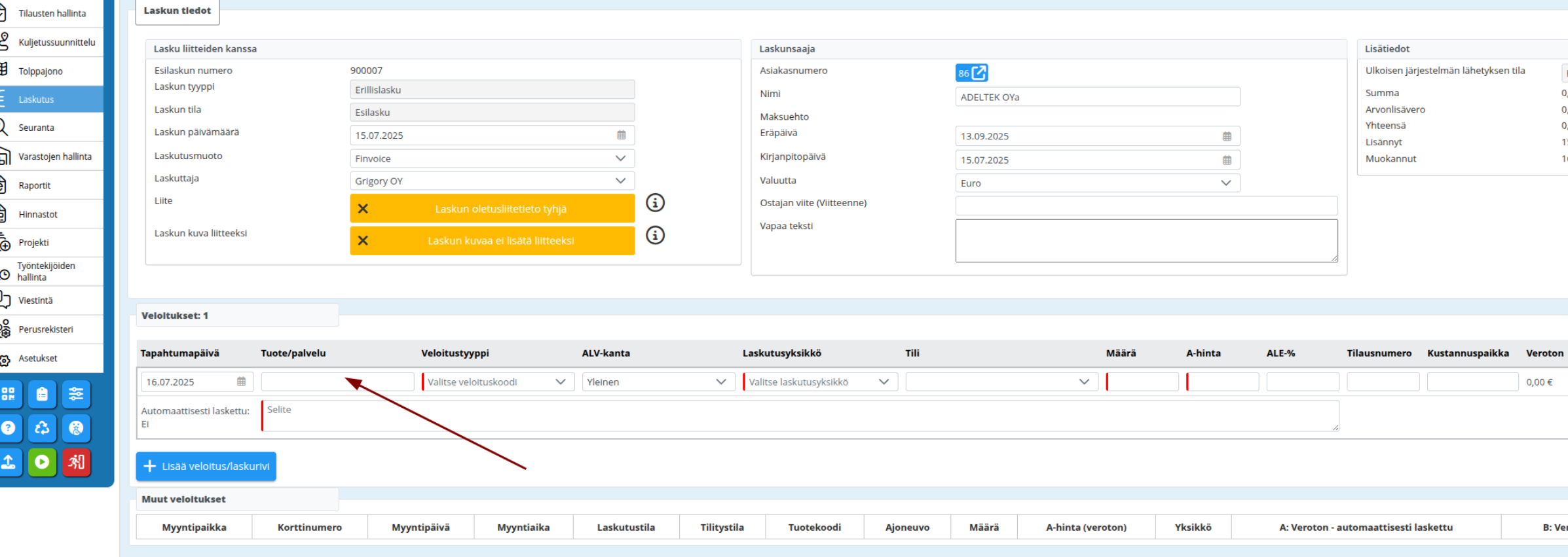 - [Muutos] Laskutus, Esilaskutus: Lisätty tuotteen valinta tuoterekisteristä laskuriville. Tuotteen valitseminen täydentää automaattisesti osan laskurivin kentistä.