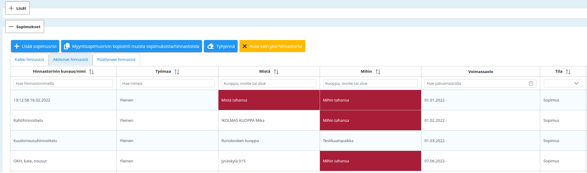 - [Muutos] Hinnastot: Lisätty hinnasto- ja sopimusriveille huomioväritys, jos rivi on voimassa “Mistä tahansa” ja/tai “Mihin tahansa”.