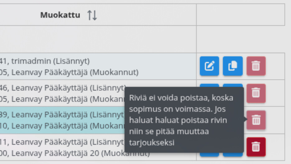 - [Uusi] Hinnastot: Lisätty osto- ja myyntisopimuksiin tooltip, joka kertoo, miksi riviä ei voi poistaa.