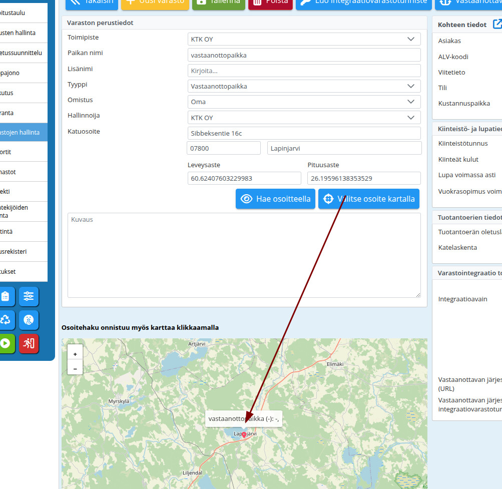 - [Muutos] Varastojen hallinta, varaston muokkaus: Muutettu varaston kartta sellaiseksi, että pitää ensin painaa nappia, jotta voi valita sijainnin kartalta.