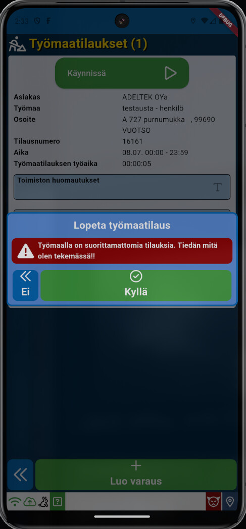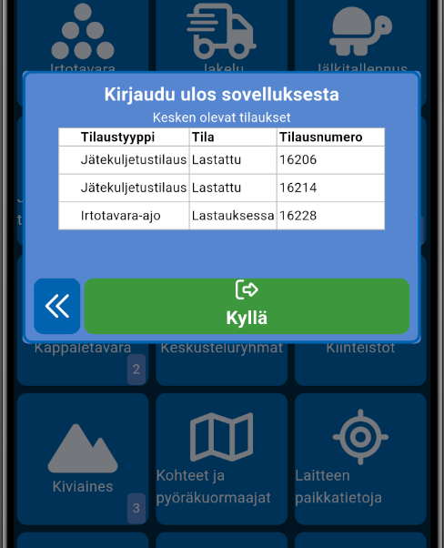 - [Muutos] Uloskirjautuessa tulee huomautus, jos tilauksia on kesken.